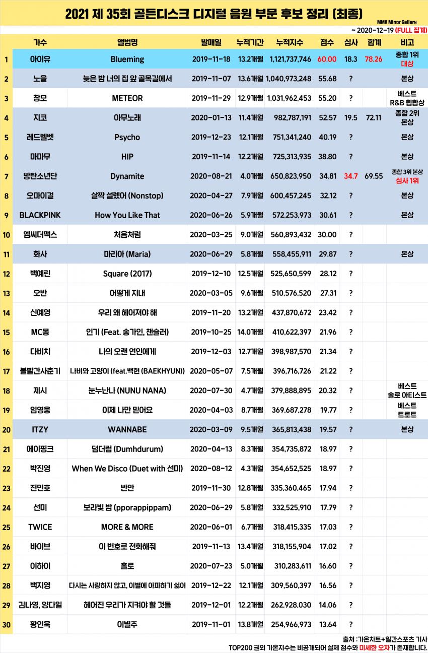 Bonsang: BLACKPINK, Hwasa, ITZY, Red Velvet, Oh My Girl, Zico, Noel, Mamamoo, IU, BTS