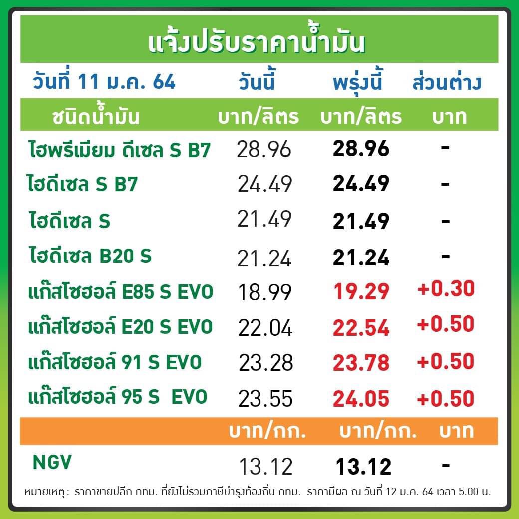 โดยน้ำมันในกลุ่มเบนซิน ปรับขึ้น 50 สตางค์/ลิตร เว้น E85 ปรับขึ้น 30 สตางค์/ลิตร โดยน้ำมันในกลุ่มดีเซล ยังคงราคาเดิม มีผลวันพรุ่งนี้ (12 ม.ค. 64) ตั้งแต่เวลาตี 5 เป็นต้นไป