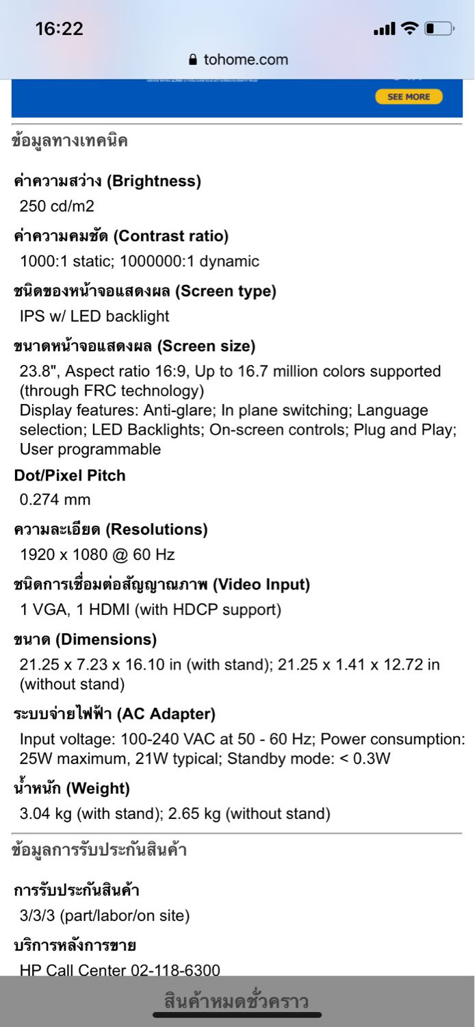 ผมอยากทราบว่า จอของ HP 24es ต้องใช้ Adaptor กี่วัตต์ ?