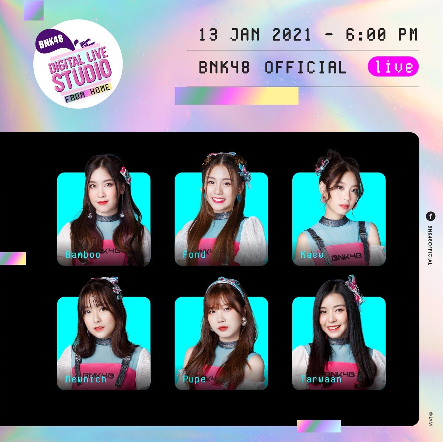ประกาศ DIGITAL LIVE FROM HOME ประจำวันที่ 5 มกราคม 2564 เวลา 18:00 น. ที่หน้าเพจ BNK48 OFFICIAL โดยมีสมาชิกที่เข้าร่วมดังนี้ #BNK48 #BNK48DigitalLiveStudio