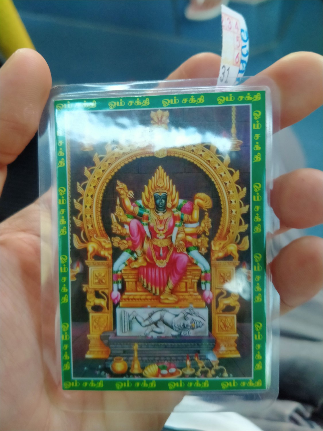 เรากับเพื่อนไปเปิดปีใหม่รับพลังงานดีๆที่วัดแขกกันมาค่ะ ตามธรรมเนียมเวลาไปไหว้วัดแขกเราจะได้การ์ดองค์เทพมาใช่ไหมคะ แต่เราสงสัยองค์แม่องนี้มาก คือมองตอนแรกท่านเหมือนพระแม่ลักษมี แต่พอดูแล้วท่านไม่ไ