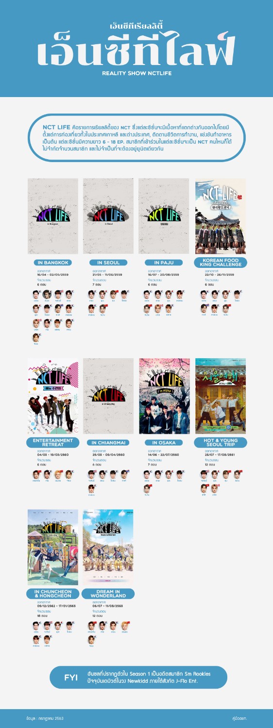 NCT เป็นวงที่มีเรียลลิตี้ชื่อ NCT Life รายการฉายผ่านช่องทางออนไลน์หลายแพทฟอร์ม ตอนนี้ 10 ซีซั่นแล้วค่ะ ไม่รวมเรียลลิตี้ของวงยูนิตอย่าง WayV อีก 2 รายการ (Dream plan, WayVision)