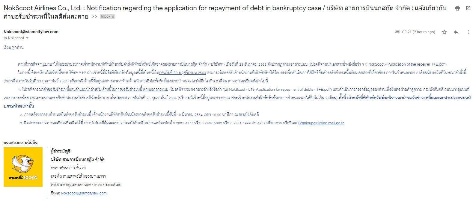 วันนี้ได้รับอีเมลจาก nokscoot ว่าให้ทำเรื่องขอเงินคืน โดยกรอกแบบฟอร์ม ปริ้นหลักฐานต่าง ๆ แล้วนำไปยื่นกับกรมบังคับคดี ด้วยตนเองภายในวันที่ 23/02/2564