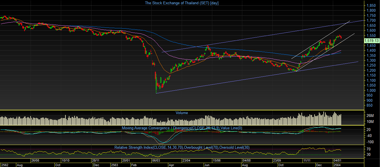 SET Index TF Day: ตลอดทั้งสัปดาห์ที่ผ่านมา ดัชนีพยายามขึ้นไปยืนเหนือ 1550 จุด แต่ท้ายที่สุด ไม่สามารถผ่านขึ้นไปได้ เนื่องจากมีสัญญาณ Bearish Divergence ปกคลุมไว้อยู่ก่อนหน้านี้ ซึ่งคาดการณ์ว่า ดัชนีจะลงมาทดสอบ กรอบแนวรับล่าง ณ ระดับ 1500 จุด แล้วดูอาการอีกครั้ง จะสามารถฟื้นตัวขึ้นไปได้หรือไม่ ถ้าหากฟื้นตัวขึ้นไปได้ ก็มีโอกาสที่จะเคลียร์แนวต้าน 1550 จุด พร้อมโบยบินสู่ดวงดาวอันไกลโพ้น แต่หากหลุดกรอบแนวรับ 1500 จุด ลงมา ก็อาจกลายเป็นการ พักฐาน ครั้งใหม่ ก็เป็นได้