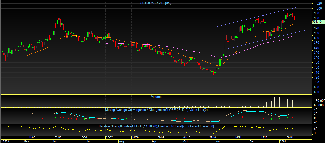 S50H21 TF Day: ตลอดทั้งสัปดาห์ที่ผ่านมา ดัชนีพยายามขึ้นไปยืนเหนือ 990 จุด แต่ท้ายที่สุด ไม่สามารถผ่านขึ้นไปได้ เนื่องจากมีสัญญาณ Bearish Divergence ปกคลุมไว้อยู่ก่อนหน้านี้ ซึ่งคาดการณ์ว่า ดัชนีจะลงมาทดสอบ กรอบแนวรับล่าง ณ ระดับ 910 จุด แล้วดูอาการอีกครั้ง จะสามารถฟื้นตัวขึ้นไปได้หรือไม่ ถ้าหากฟื้นตัวขึ้นไปได้ ก็มีโอกาสที่จะเคลียร์แนวต้าน 990 จุด พร้อมโบยบินสู่ดวงดาวอันไกลโพ้น แต่หากหลุดกรอบแนวรับ 910 จุด ลงมา ก็อาจกลายเป็นการ พักฐาน ครั้งใหม่ ก็เป็นได้