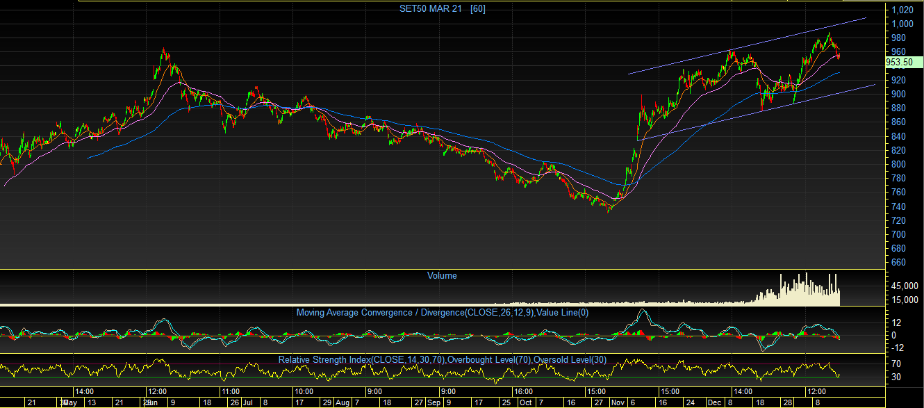 S50H21 TF60 Min: หลายวันที่ผ่านมา ดัชนียังคงพุ่งทะยานขึ้นไปอย่างต่อเนื่อง จนถึงระดับ 990 จุด เริ่มเห็นแรงเทขาย และ ย่อตัวลงมา เนื่องจากมีสัญญาณ Bearish Divergence ปกคลุมไว้อยู่ก่อนหน้านี้ ซึ่งคาดว่า ดัชนีจะลงมาทดสอบแนวรับเส้น EMA200 วัน หรือ กรอบแนวรับล่าง ณ ระดับ 930 910 ตามลำดับ แล้วดูอาการว่าจะสามารถฟื้นตัวได้หรือไม่ หากฟื้นตัวได้ ก็มีโอกาสกลับไปเคลียร์แนวต้าน 990 จุด พร้อมโบยบิน สู่ดวงดาวอันไกลโพ้น แต่ถ้าหากหลุดแนวรับ 910 จุด ลงมา ก็อาจกลายเป็นการพักฐาน ครั้งใหม่ ก็เป็นได้