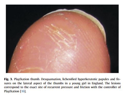 2. PlayStation Thumb - หนา เป็นตุ่มน้ำ หรืออาจมีรอยแตกบริเวณนิ้วหัวแม่มือ อาการนี้จะพบมากในเด็กผู้หญิงมากกว่าเด็กผู้ชาย เกิดจากการเล่นเกมนานเกินไปเช่นกัน อาการสามารถหายไปได้เมื่อหยุดเล่น 2 สัปดาห์