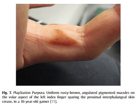 4. PlayStation Purpura - เป็นผื่นราบสีน้ำตาลบริเวณนิ้วมือช่วงข้อแรก ซึ่งพบว่าส่วนข้างใต้มีเลือดคั่งอยู่ เกิดจากการใช้ controller ชนิด DualShock3 ของเครื่อง PlayStation3 เป็นเวลานาน (ติดเกม) - แล้วถ้าเปลี่ยนมาเป็นสั่นแบบหลากสัมผัสจาก DualSense จะดีขึ้นไหมนะ