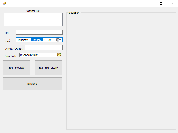 ในโปรเจคตัวอย่างเค้าแสดงเป็นรูปรูปเดียว แต่ผมลองปรับมาให้แสดงทีละหลายๆรูปตามเอกสารที่ Scan เข้าไป แล้วยัดเข้าไปใน Groupbox อีกที คือถ้าเป็นเว็บไซต์ ก็จะสร้าง div ที่เป็น Container ไว้ตัวหนึ่งแล้วก็เอารูปใส่ๆเข้าไป