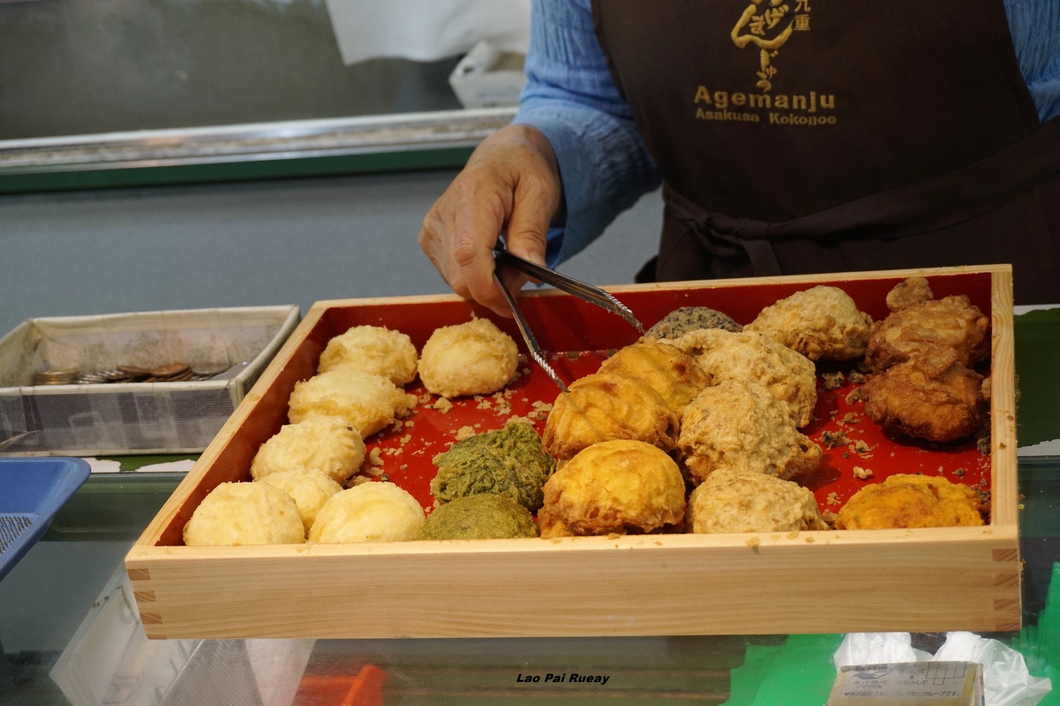 หลังจากทำงานเสร็จผมก็ต้องเดินทางกลับนาโกย่าทันทีเพราะระยะทางไกลใช้เวลาเดินทางนาน เราแวะพักต่อรถไฟที่โตเกียวมีเวลาเหลือระหว่างต่อรถผมจึงได้เดินทางไปเที่ยวที่วัดอาซากุสะ ซื้อของติดไม้ติดมือกลับมาฝากคนทางบ้านนิดหน่อย และที่พลาดไม่ได้เลยคือ ใครที่มาที่นี่ต้องมาทาน ซาลาเปาทอด อร่อย กรอบ นุ่ม สมคำร่ำลือจริงๆ ผมทานไปทุกรสชาติเลย ส่วนตัวชอบรสชาเขียว หอม อร่อย ไม่มันเกินไป และเวลานั้นเป็นช่วงที่คนทำงานก็เลิกงานกันพอดี คนก็จะออกมาเดินเล่นคลายเครียดหลังเลิกงาน หาอะไรทานเล่นกัน