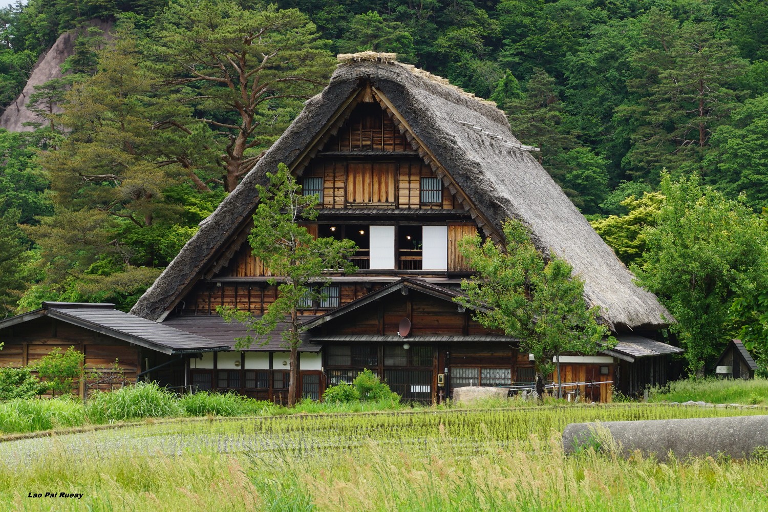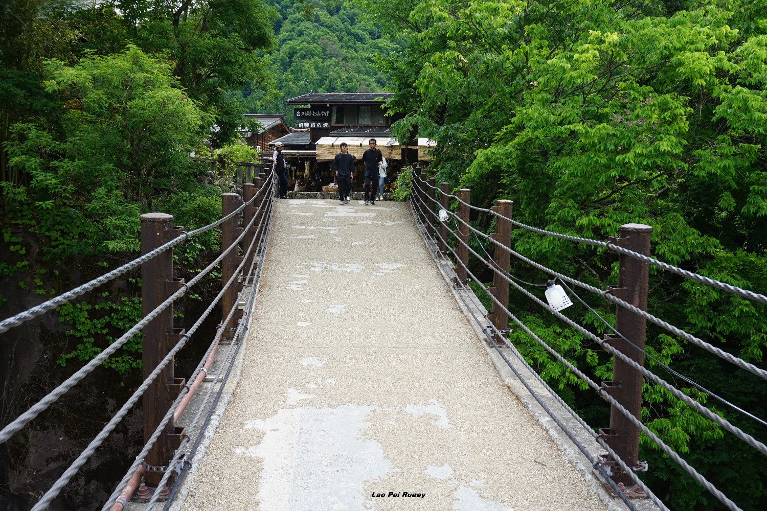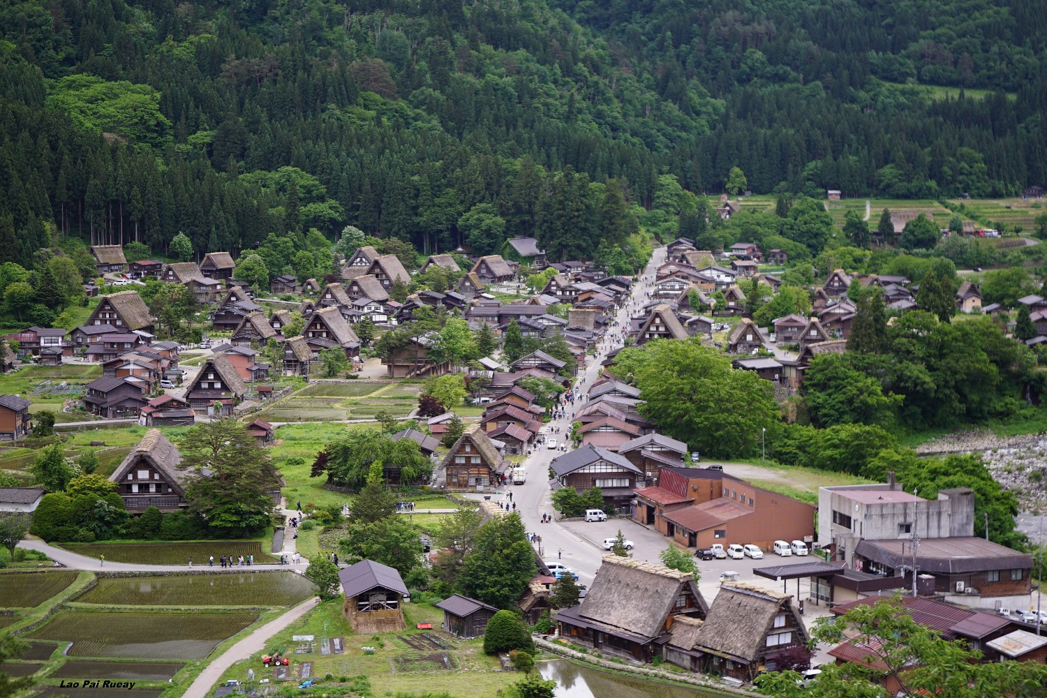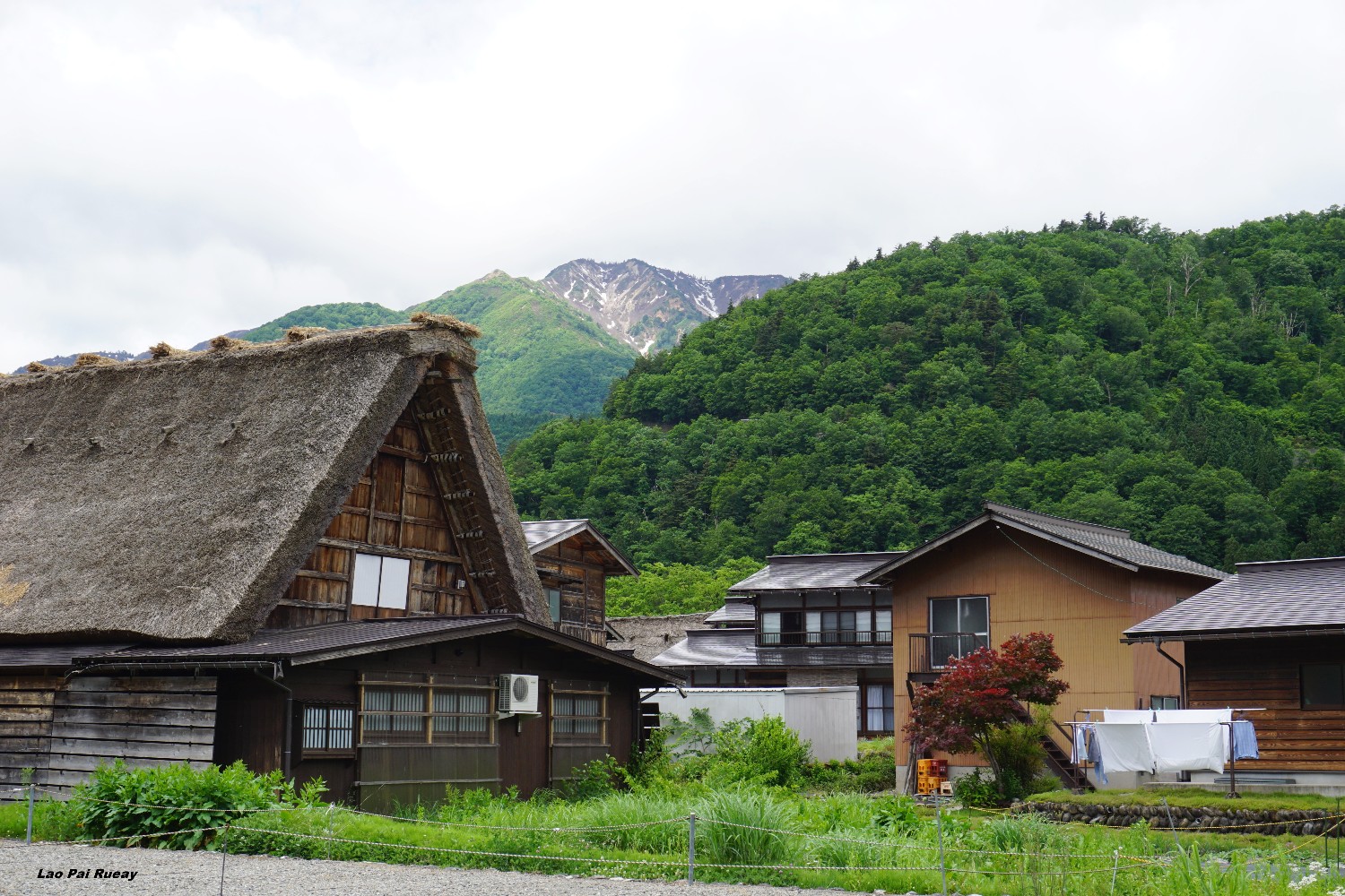 ผมเดินทางมาเที่ยวที่แรกคือหมู่บ้าน Shirakawa-go เป็นหมู่บ้านเก่าแก่ตั้งอยู่ในเขตจังหวัด Gifu ซึ่งหลายคนอาจจะเห็นชิราคาวะโกะในแบบที่เป็นหมู่บ้านถูกปกคลุมไปด้วยหิมะ การได้เห็นชิราคาวะโกะในเป็นสีเขียว สดใส ก็เป็นบรรยากาศที่ดีไปอีกแบบหนึ่ง เหมือนผมได้หลงไปอยู่ในยุคโบราณของญี่ปุ่นเลย ผมก็ได้เดินเล่นไปในตัวหมู่บ้านและแวะถ่ายรูปตามร้านค้าต่างๆ มีพวกตะกร้าหวาย ขนม ของใช้พื้นเมืองเยอะแยะไปหมด