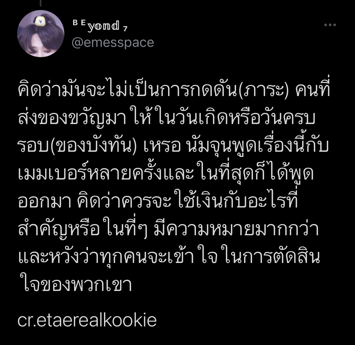 บังทัน บิ๊กฮิตปิดไม่ให้ส่งของขวัญตั้งแต่ปี 61 ค่ะ บังทันอยากให้อาร์มี่ใช้เงินกับอะไรที่สำคัญหรือในที่ๆ มีความหมายมากกว่า ส่วนเหตุผลตามภาพเลยค่ะ