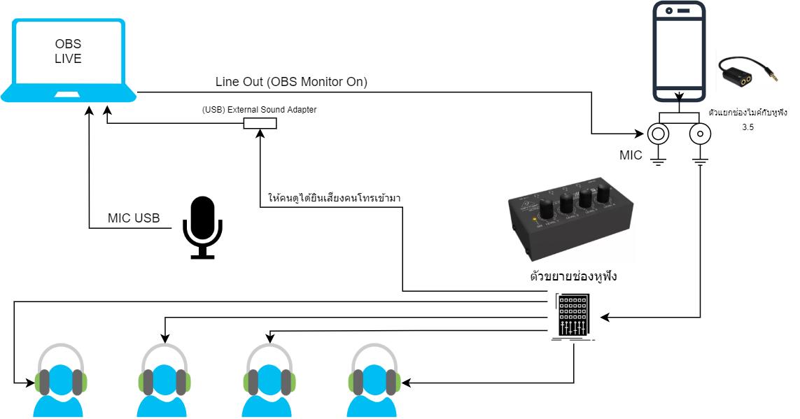 สวัสดีครับอยากสอบถามว่าจะทำไลฟ์สดแล้วให้มีคนโทรเข้ามาใช้ obs เป็นตัวไลฟ์ สามารถต่อตามรูปนี้ได้ไหมครับ หรือ มีอุปกรณ์อื่นที่ง่ายกว่าในรูปไหมครับ ขอบคุณมากครับ