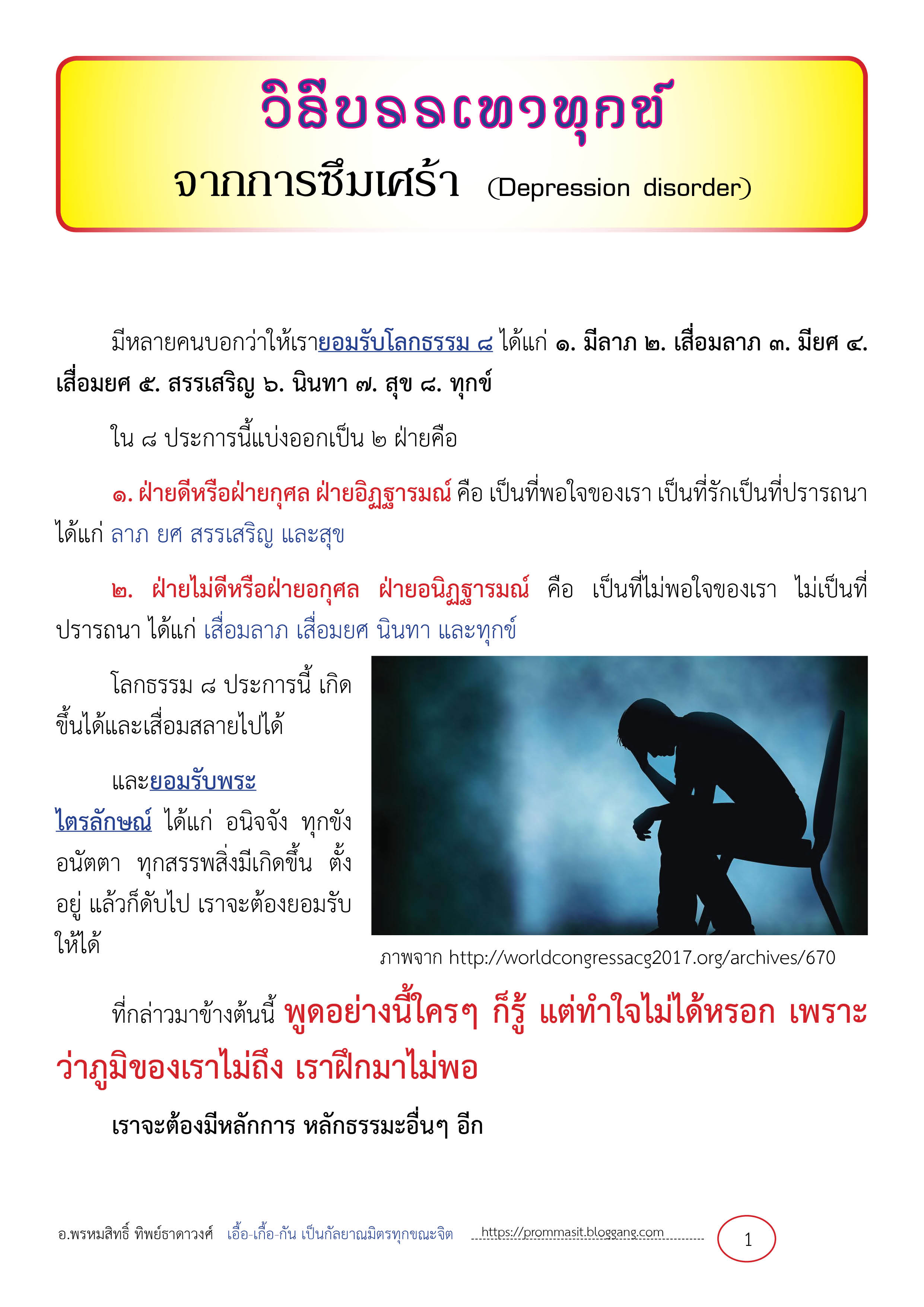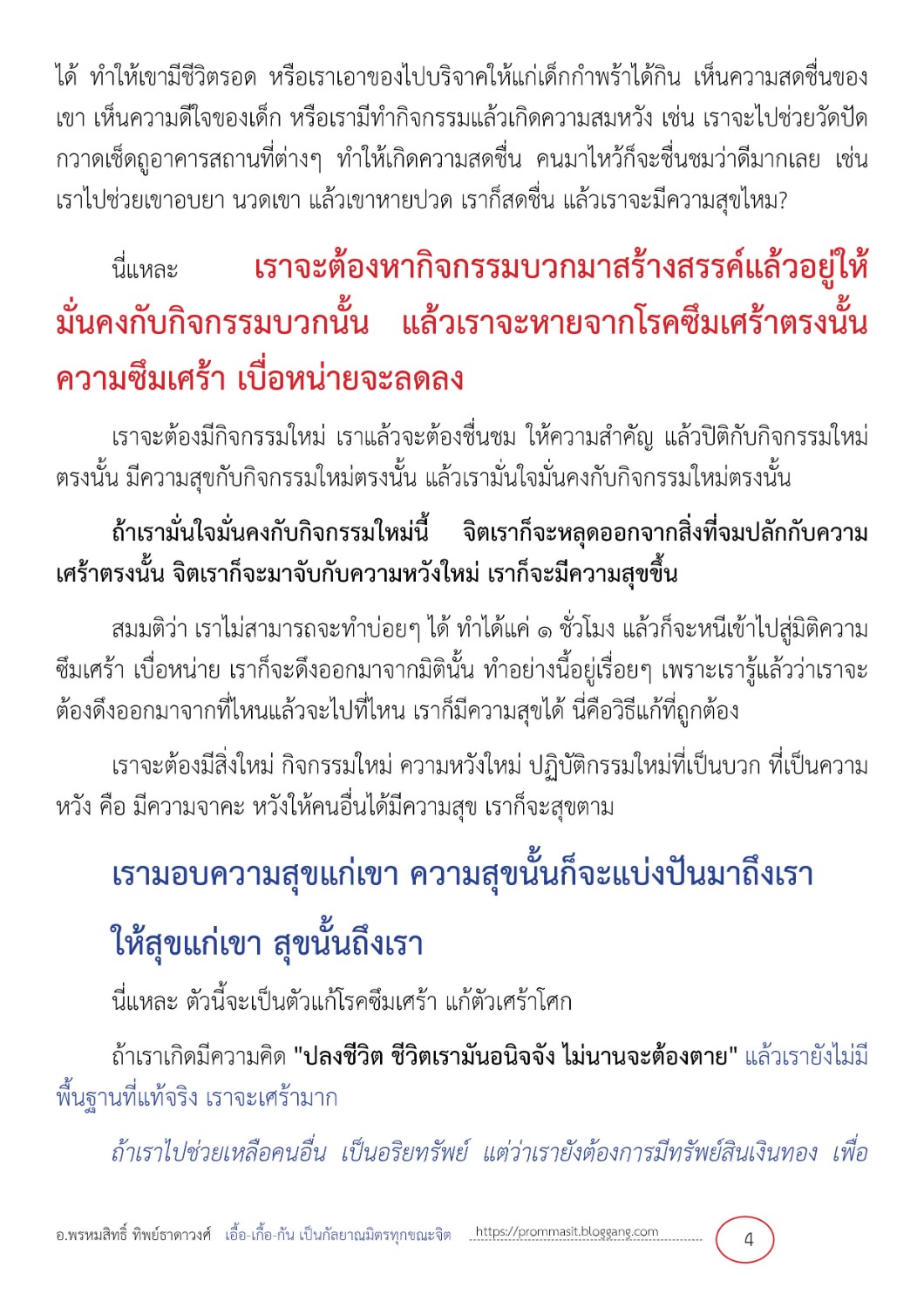 นี่แหละ เราจะต้องหากิจกรรมบวกมาสร้างสรรค์แล้วอยู่ให้มั่นคงกับกิจกรรมบวกนั้น แล้วเราจะหายจากโรคซึมเศร้าตรงนั้น ความซึมเศร้า เบื่อหน่ายจะลดลง