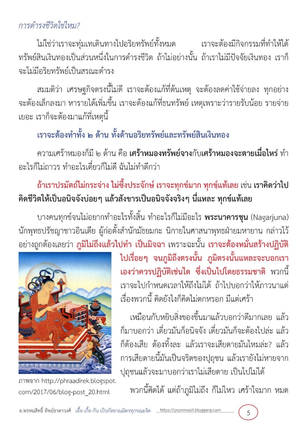 บางคนทุกข์จนไม่อยากทำอะไรทั้งสิ้น ทำอะไรก็ไม่มีอะไร พระนาคารชุน (Nagarjuna) นักพุทธปรัชญาชาวอินเดีย ผู้ก่อตั้งสำนักมัธยมกะ นิกายในศาสนาพุทธฝ่ายมหายาน กล่าวไว้อย่างถูกต้องเลยว่า ภูมิไม่ถึงแล้วไปทำ เป็นมิจฉา เพราะฉะนั้น เราจะต้องหมั่นสร้างปฏิบัติไปเรื่อยๆ จนภูมิถึงตรงนั้น ภูมิตรงนั้นแหละจะบอกเราเองว่าควรปฏิบัติเช่นใด ซึ่งเป็นไปโดยธรรมชาติ พวกนี้เราจะไปกำหนดเวลาให้ถึงไม่ได้ ถ้าไปบอกว่าให้ภาวนาแต่เรื่องพวกนี้ คิดยังไงก็คิดไม่ตกหรอก มีแต่เศร้า