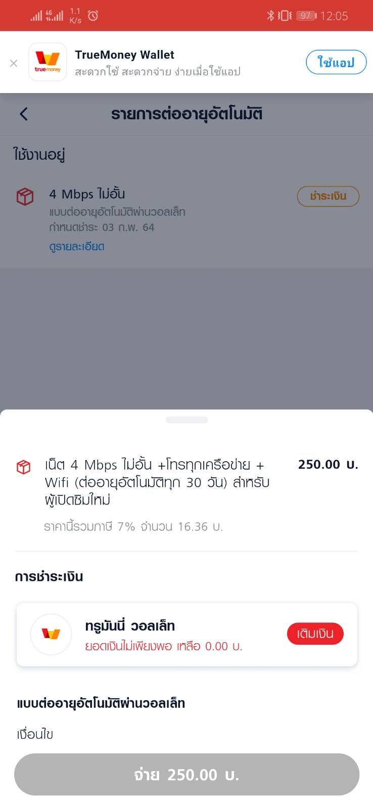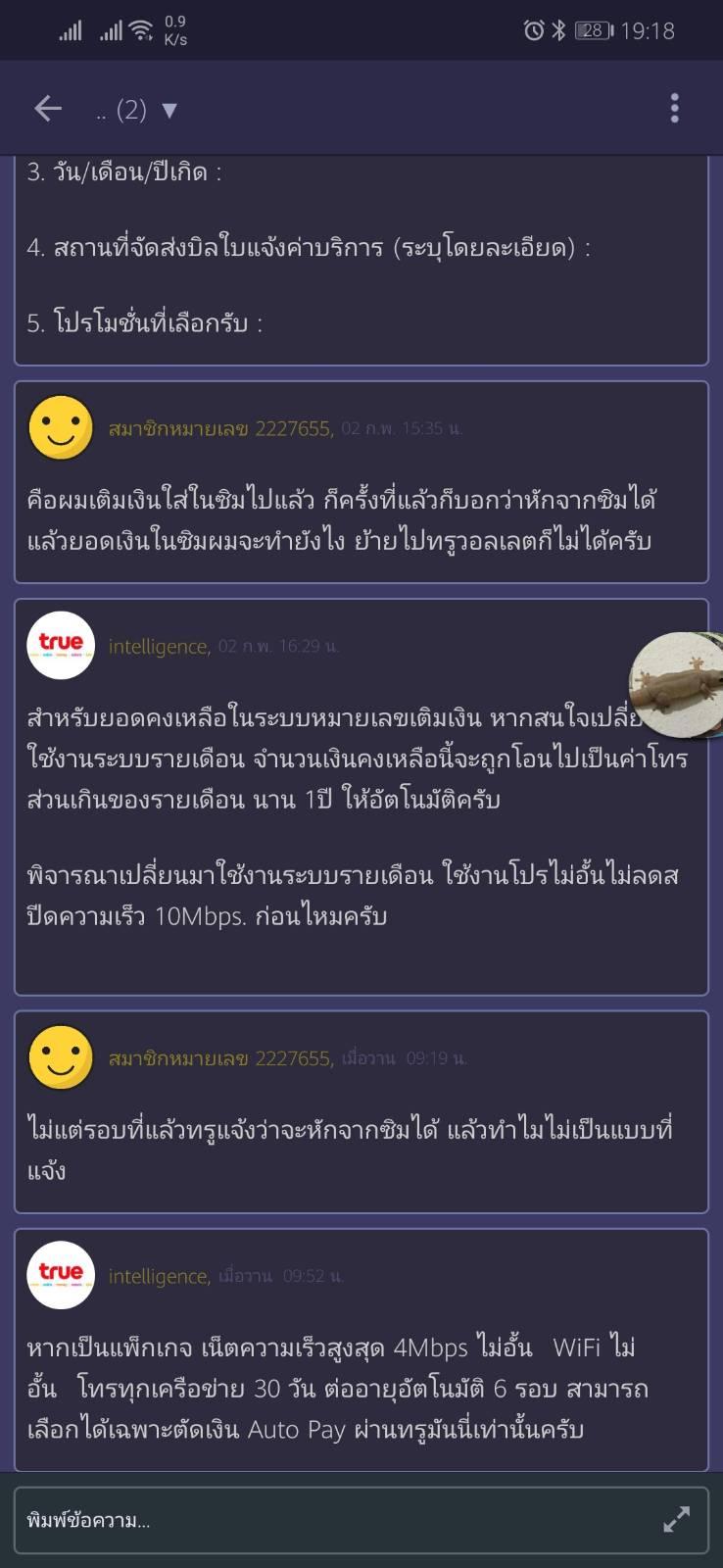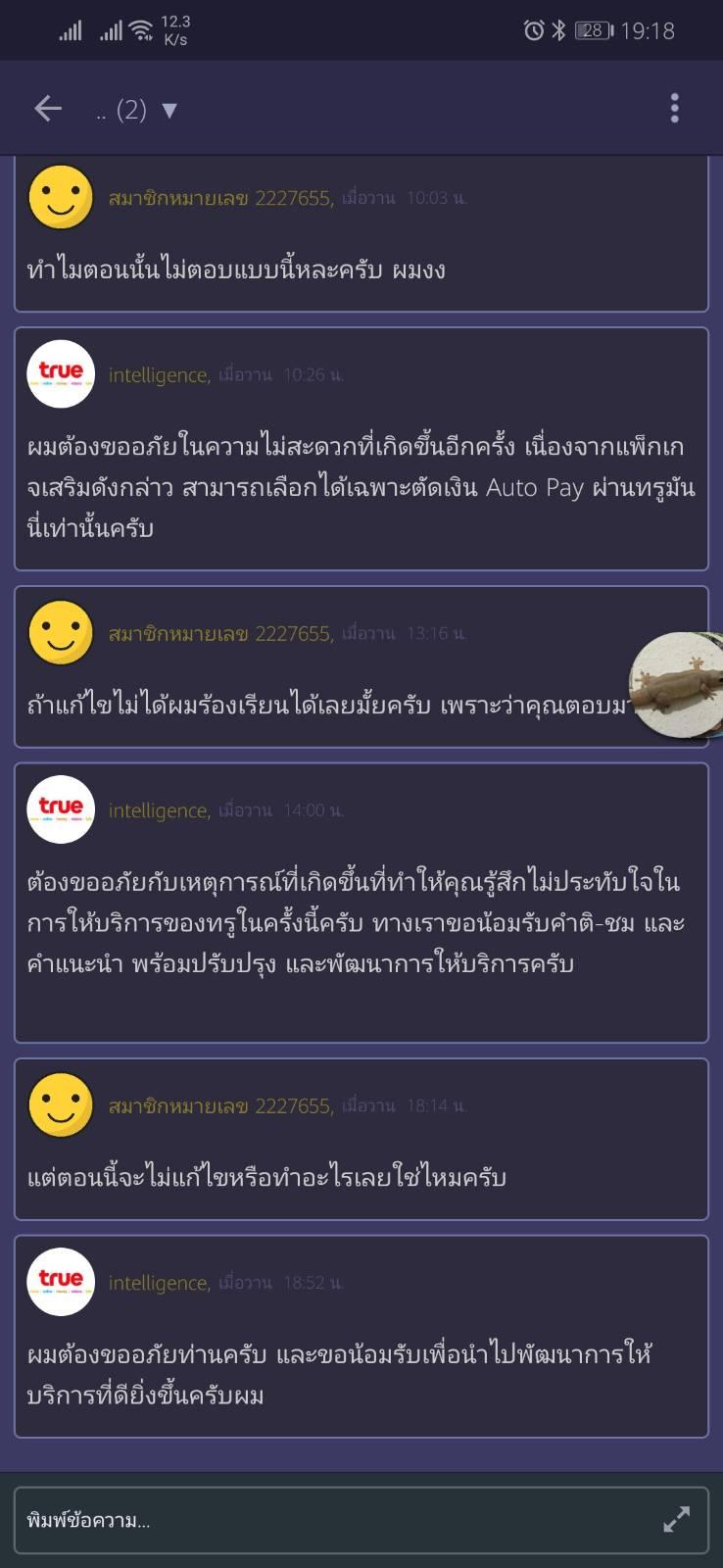 คือครั้งแรกที่มีปัญหาผมเติมเงินเข้าซิมแล้วจะสมัครโปรแต่โปรไม่มีบอกแต่ทีแรกว่าต้องจ่ายผ่านทรูวอลเลตเลยมาตั้งกระทู้ถาม ทรูก็เข้ามาตอบว่าครั้งแรกจ่ายผ่านทรูวอลเลตหลังจากนั้นจะหักจากซิมได้ พอมาวันหมดโปรมันตัดโปรไปเลยไม่ต่ออะไร มาโพสถามอีกทีเป็นตามภาพ
