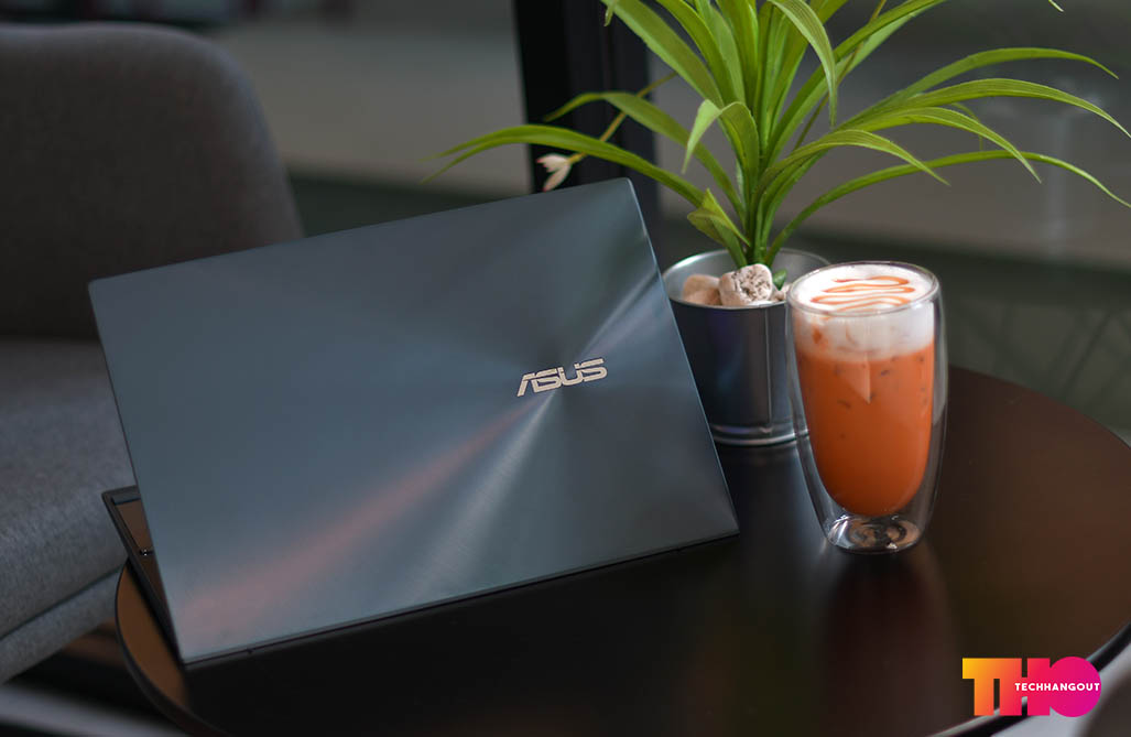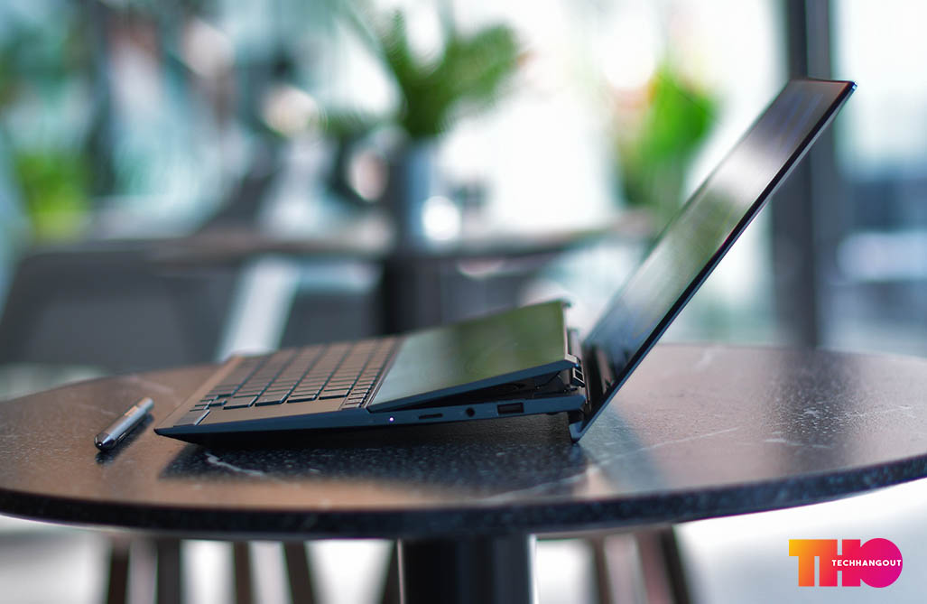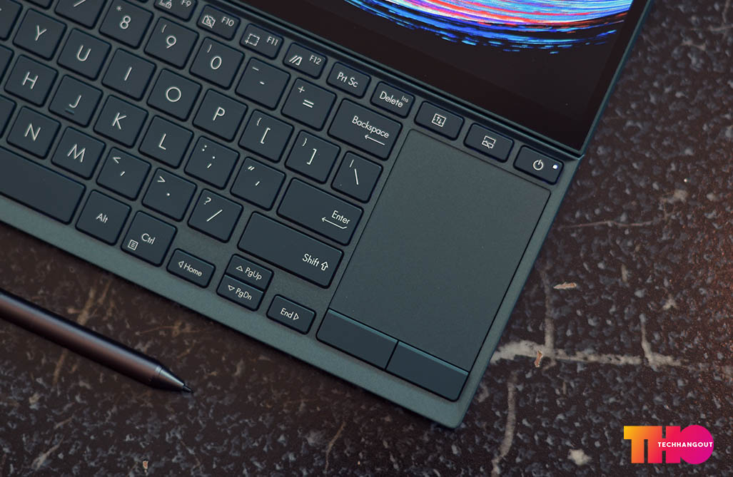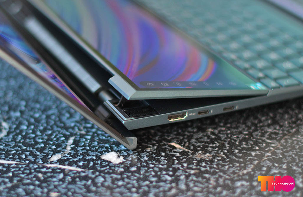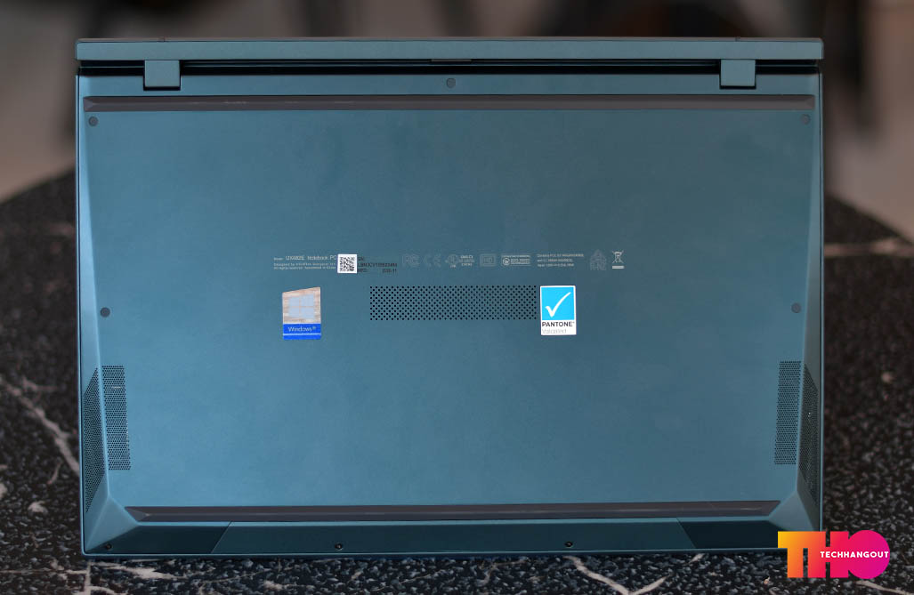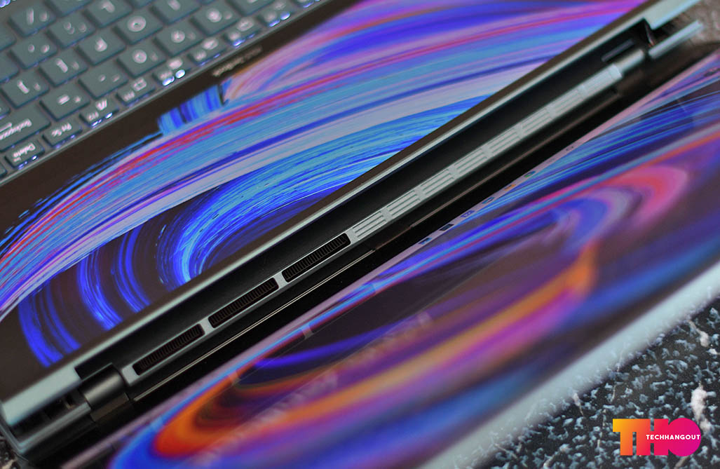 ในส่วนของฝาหลังนั้นจะเห็นว่าเป็นสีที่จะออกฟ้าๆน้ำเงินในเรื่องของลวดลายฝาหลังนั้นจะคงเป็นเหมือนรุ่นก่อนๆเป็นลายวงสวยงามพร้อมกับออกผิวด้านๆกึ่งเงาเล็กน้อย ทำให้เล่นกับแสงสะท้อนได้ดี แต่ก็อาจจะมีรอยนิ้วมือได้ง่ายพอสมควร ฝาหลังนั้นเป็นวัสดุอลูมิเนียมทั้งชิ้นแบบตัดขอบสวยงาม และเมื่อเปิดขึ้นก็จะยกตัวเครื่องขึ้นไปด้วย ส่วนด้านในนั้นเราจะเห็นการวางคีย์บอร์ด Layout แบบใหม่ที่จะคล้ายกับตัว ROG Zephyrus Duo นั้นเองแต่ก็แทนที่พื้นที่ว่างข้างบนด้วยหน้าจอ และ ย้ายคีย์บอร์ดมาล่างสุด แถมตัวที่รองมือมาให้ด้วยทำให้พิมพ์งานได้ง่ายยิ่งขึ้น ส่วนหน้าจอทำได้ค่อนข้างบางและสวยงามทั้งด้านบนและจอที่ 2 แต่จอด้านล่างนั้นจะเป็นจอด้านและมีการยกขึ้นมาเยอะมาก