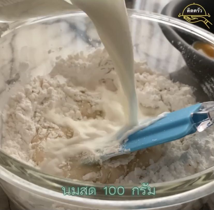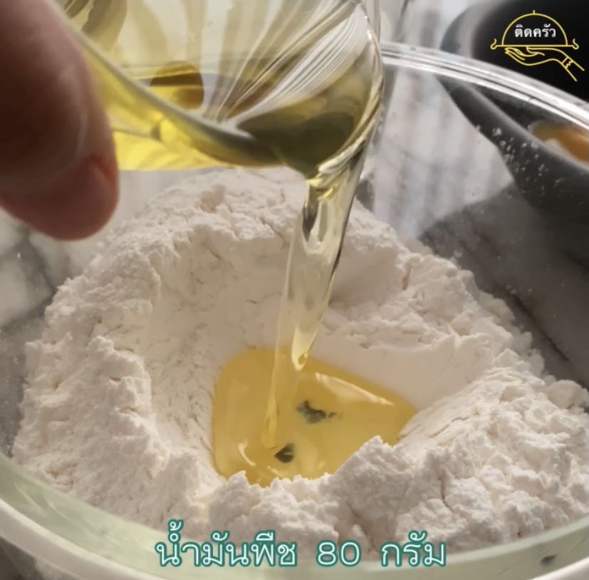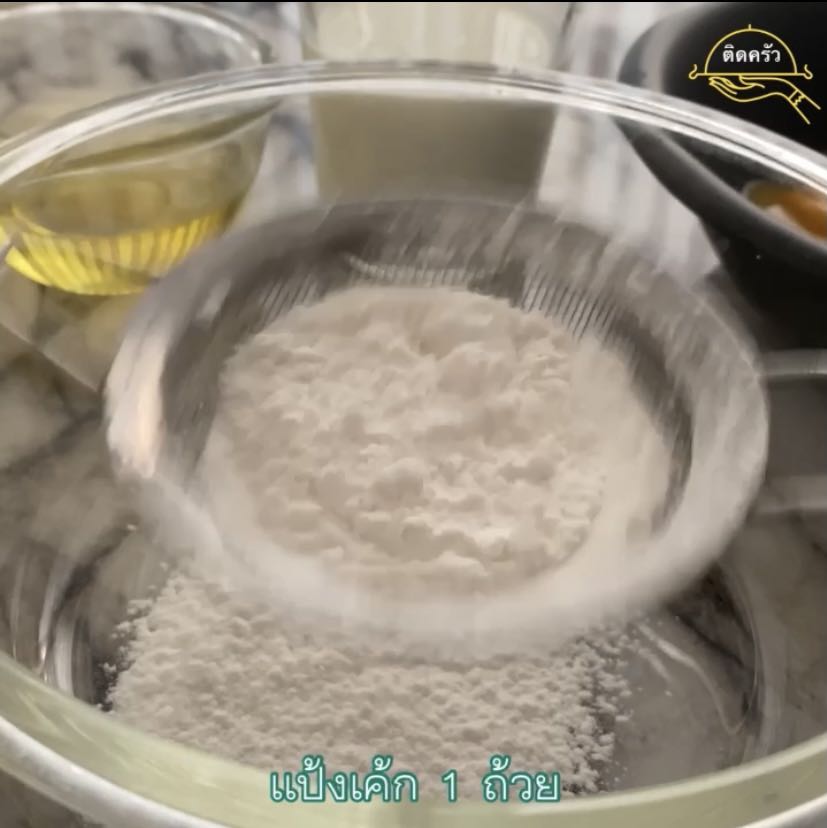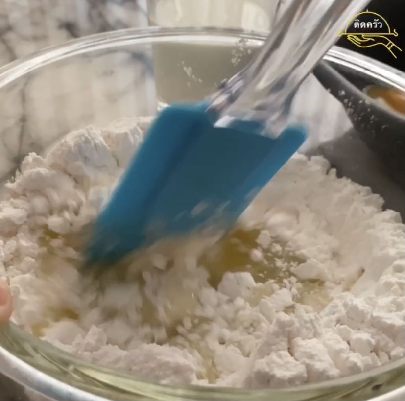 ร่อนแป้งเค้ก ผสมน้ำมันพืช และทยอยผสมนมสด