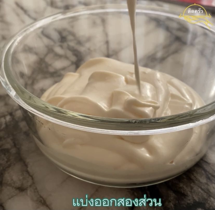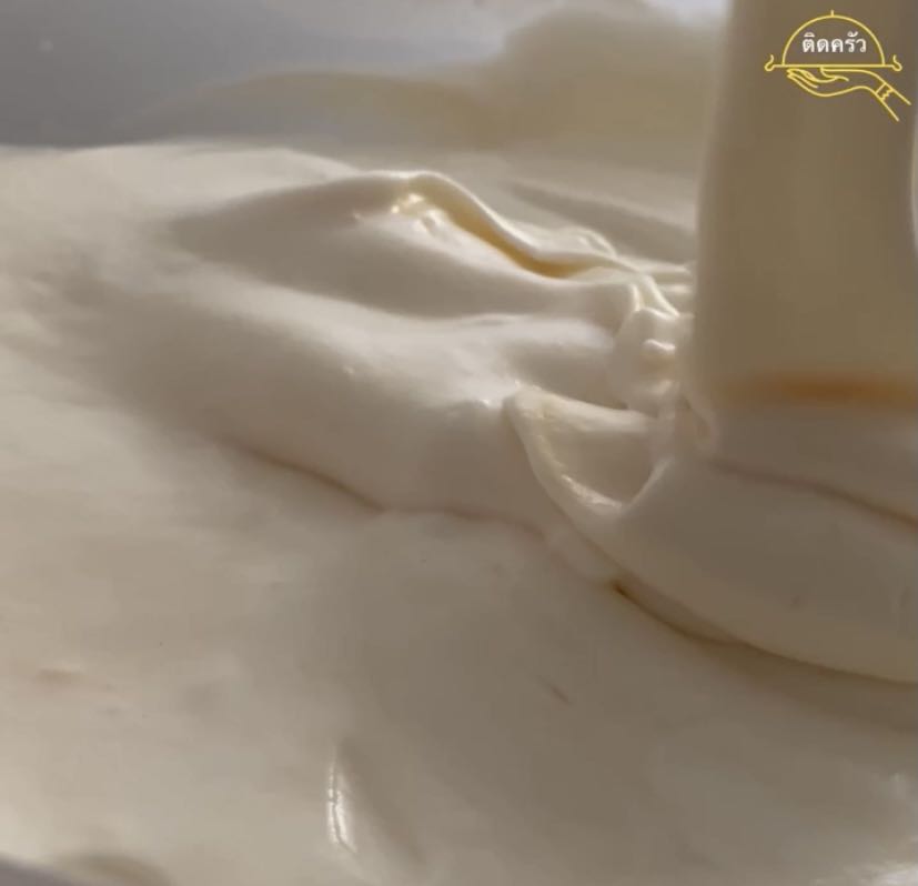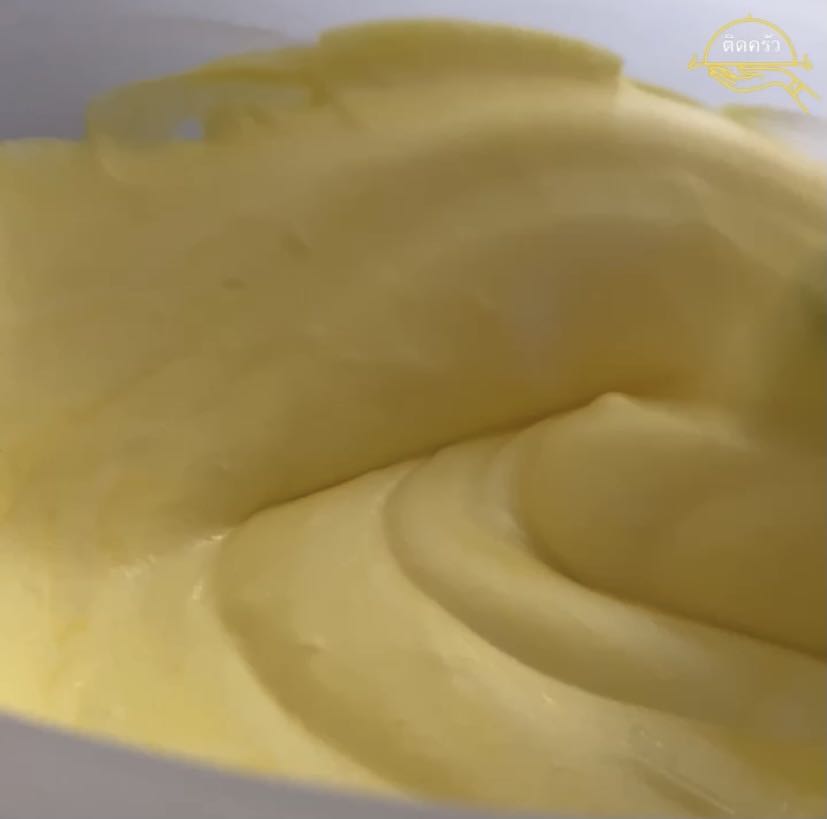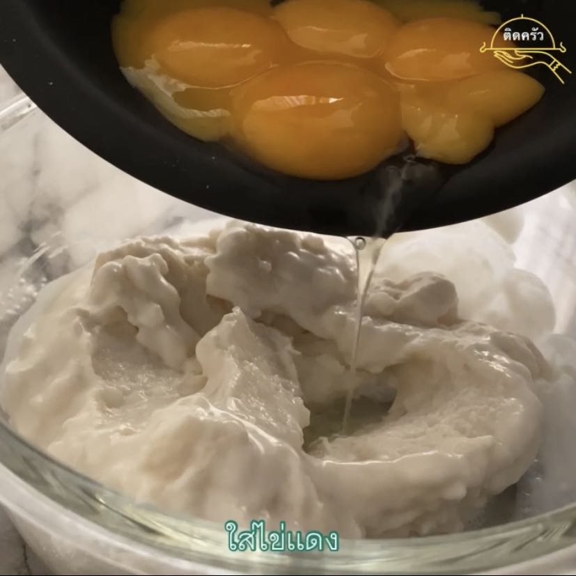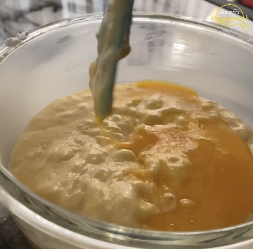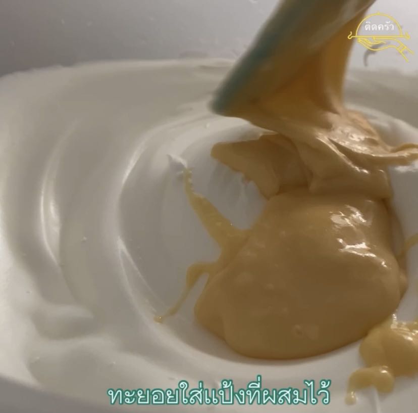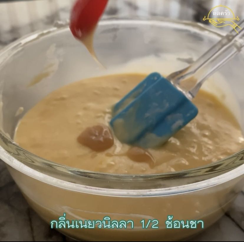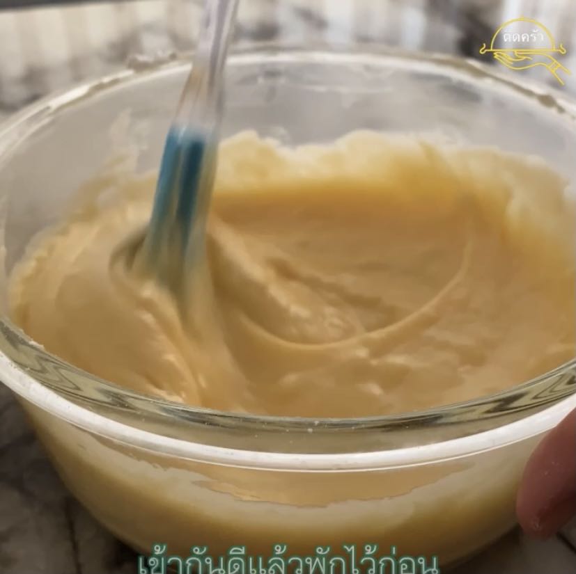 ทยอยผสมกับไข่แดงทีละฟอง และเติมกลิ่นเนยวนิลลา