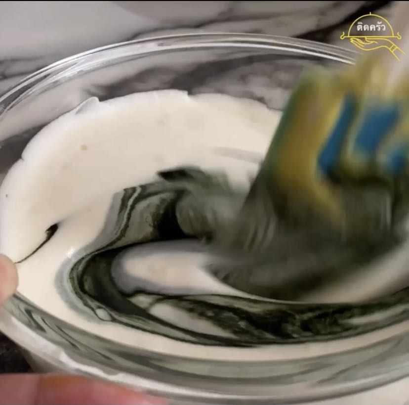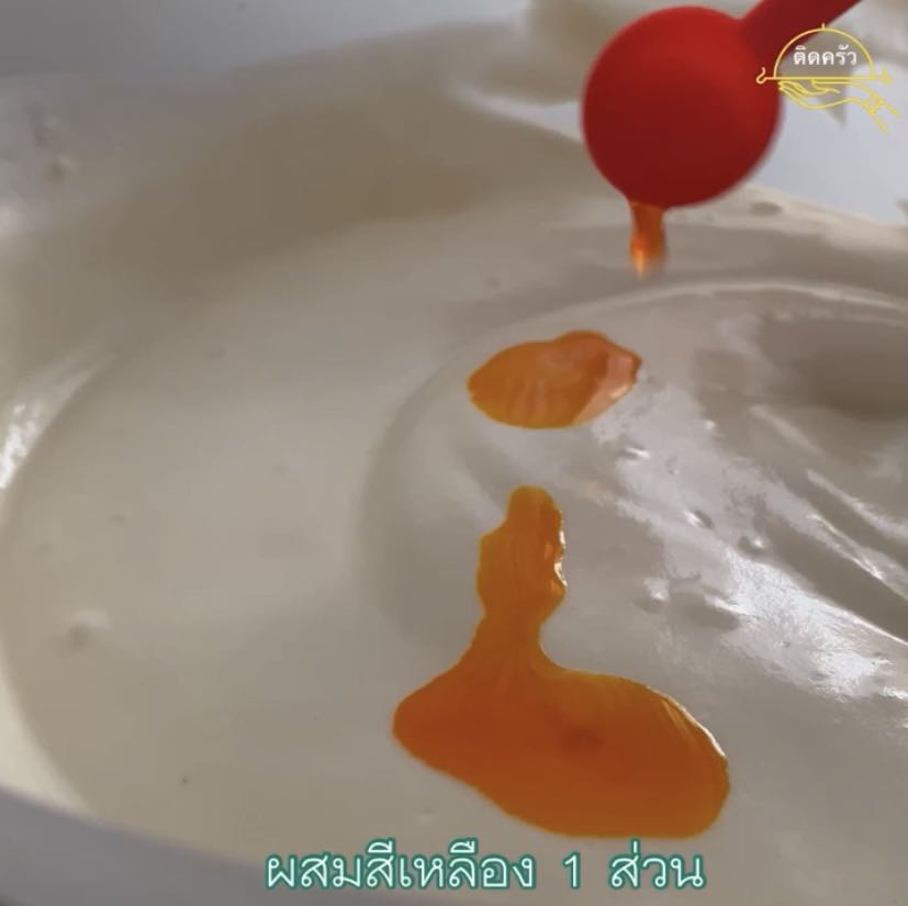 จากนั้นนำส่วนผสมสองอย่างค่อยตะล่อมให้เข้ากัน แล้วแยกออกเป็นสองส่วน ผสมสีเหลืองหนึ่งส่วน