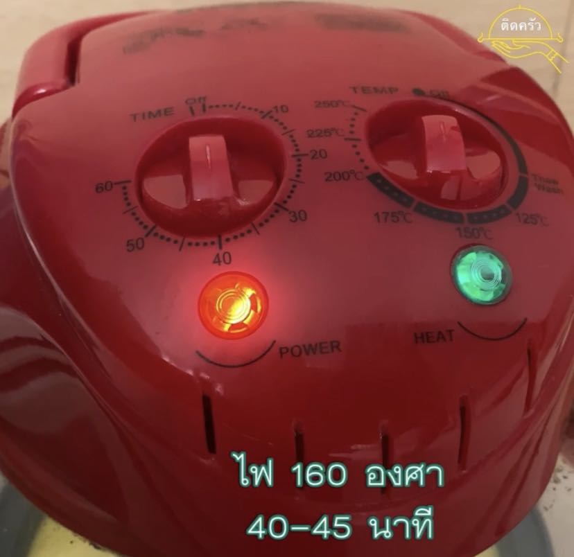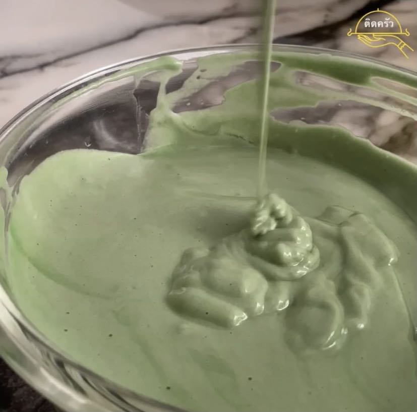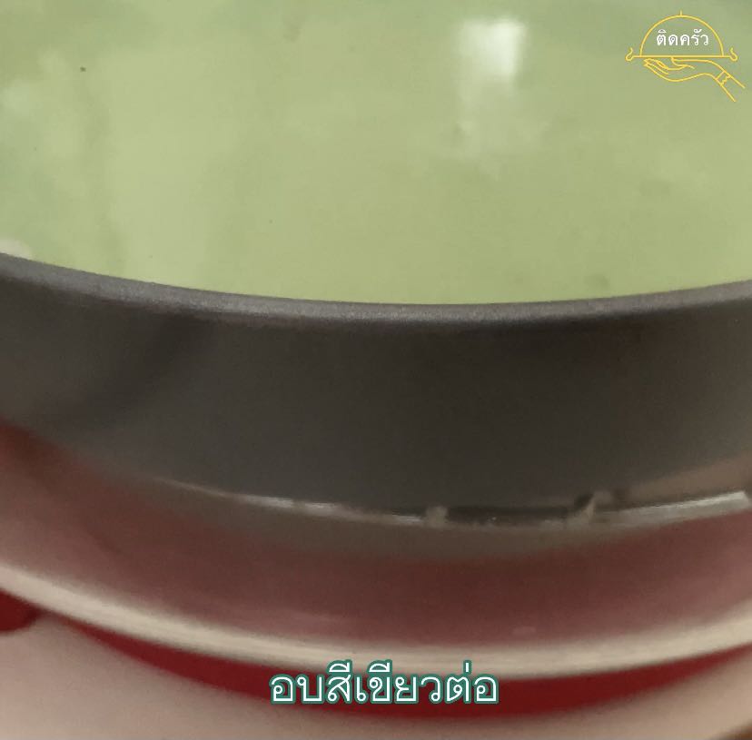 เทใส่พิมพ์แล้วนำไปอบหม้ออบลมร้อน ไฟ160 องศา 40-45 นาที จนสุก แล้วอบสีเขียวต่อ