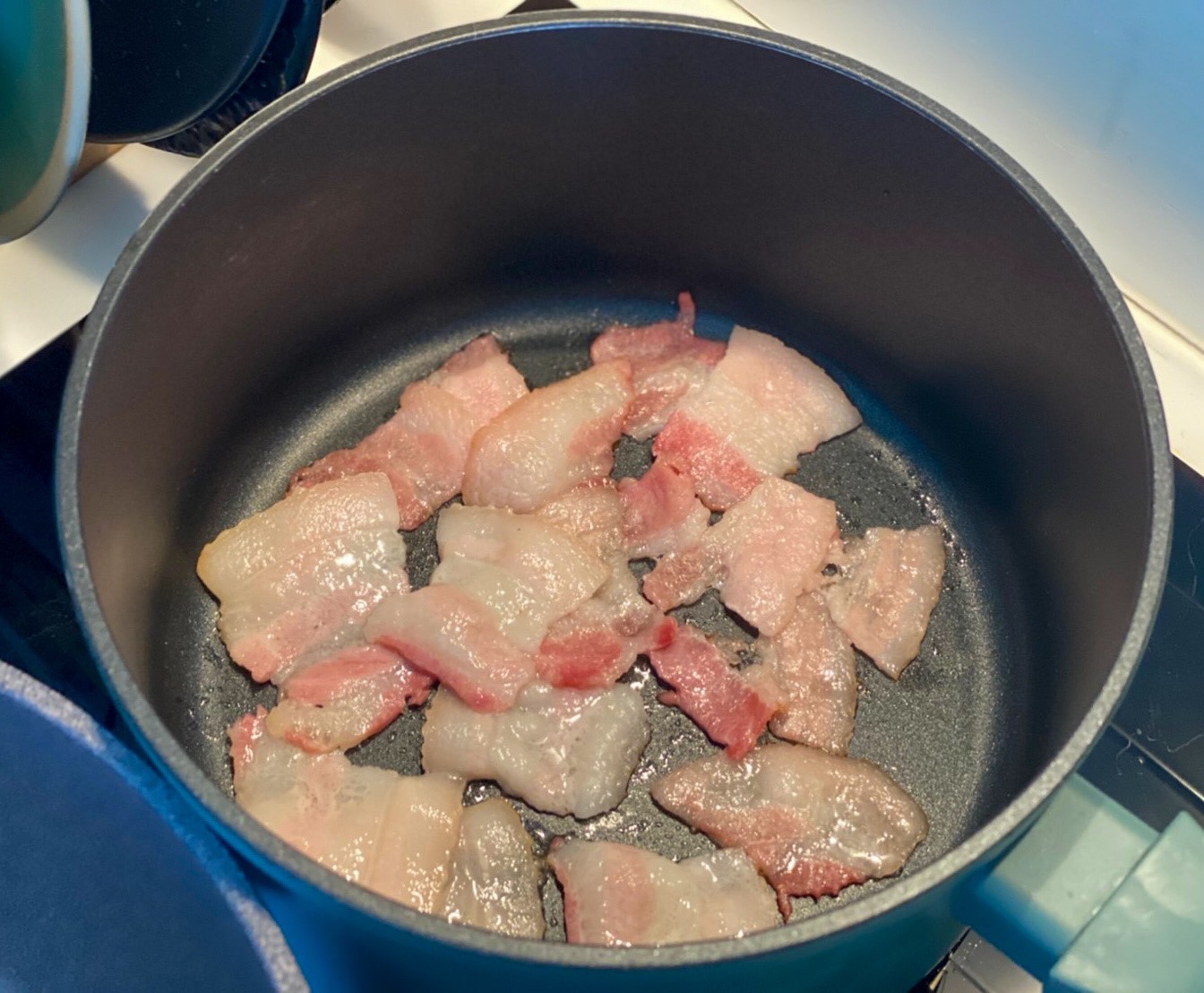 2.เตรียมเบค่อนหั่นสำหรับรองฐานหม้อ