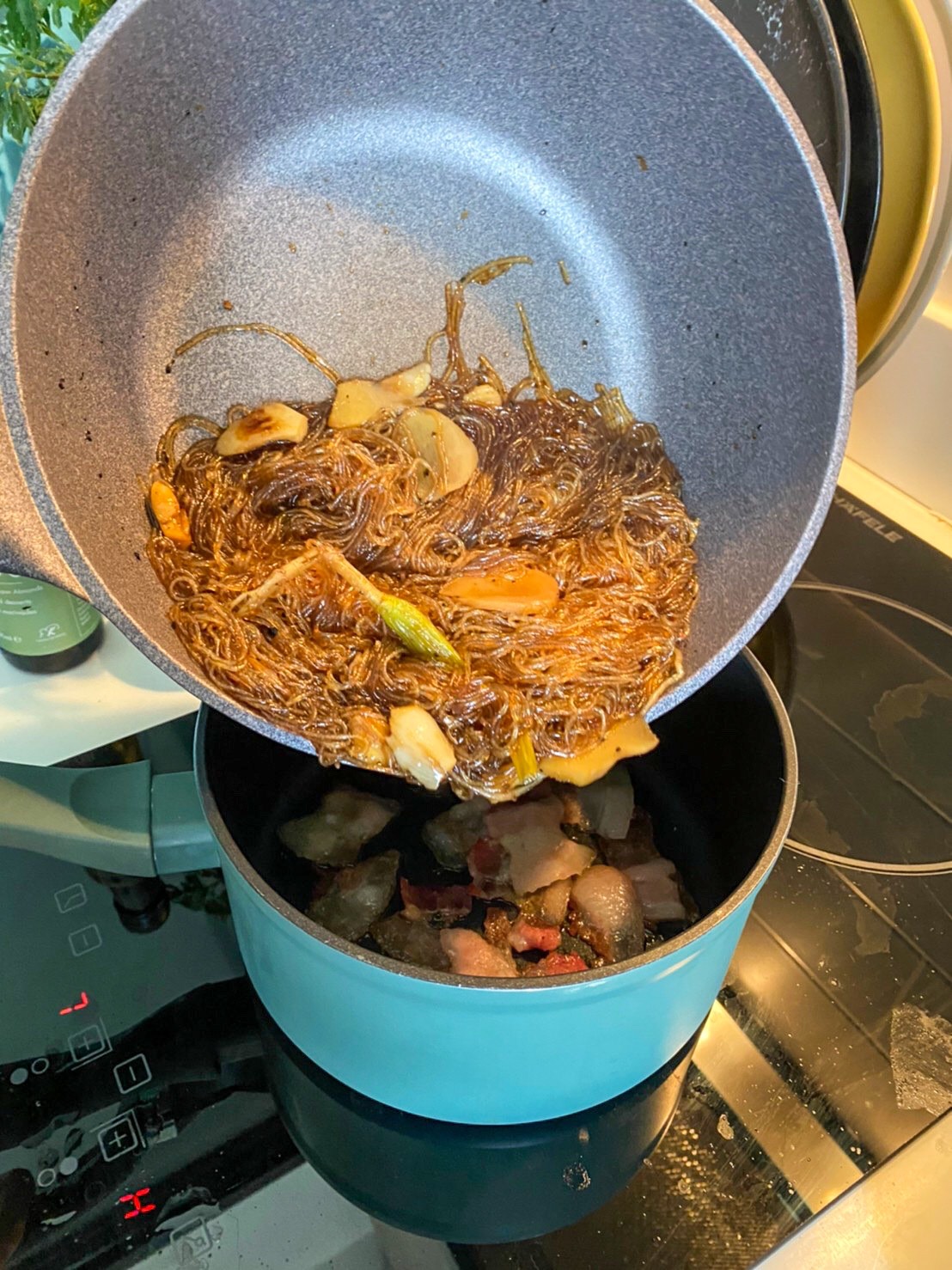 4.น้ำเดือดใส่วุ้นเส้นลงปาย รอจนน้ำงวด แล้วเอามาใส่หม้ออบที่มีเบค่อน รอง