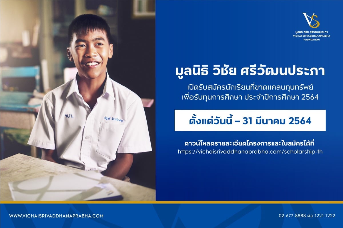 ข่าวดีสำหรับน้องๆ เยาวชนที่มีความประพฤติดี แต่ขาดแคลนทุนทรัพย์ มูลนิธิ วิชัย ศรีวัฒนประภา ได้มอบโอกาสทางการศึกษาให้กับน้องๆ ที่ต้องการเรียนต่อชั้น ม.1 , ม.4 หรือ ปวช.1 โดยส่งใบสมัครขอรับทุนการศึกษาตั้งแต่วันนี้ – 31 มีนาคม 2564