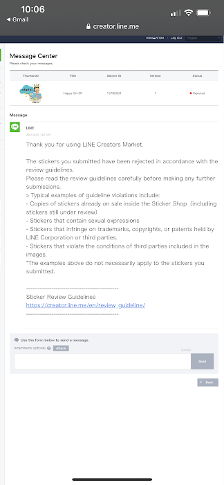 Thank you for using LINE Creators Market The stickers you submitted have been rejected in accordance with the review guidelines. Please read the review guidelines carefully before making any further s