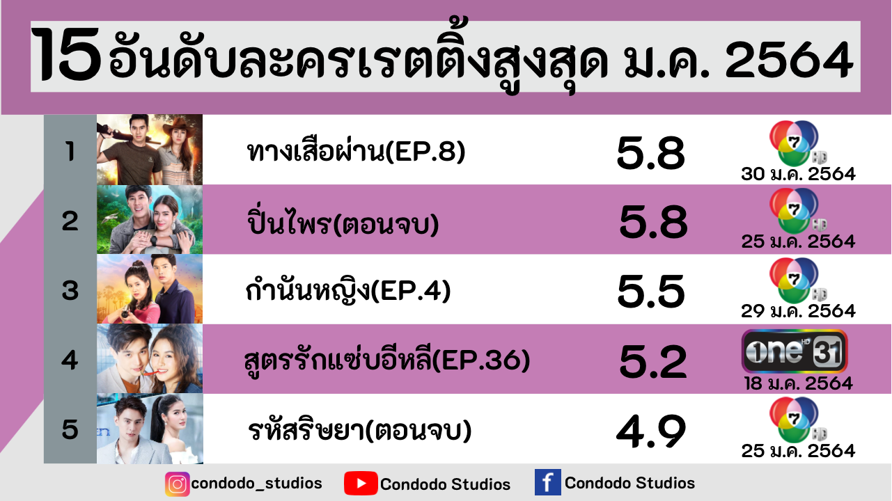 15 อันดับละครเรตติ้งสูงสุด ประจำเดือน มกราคม 2564