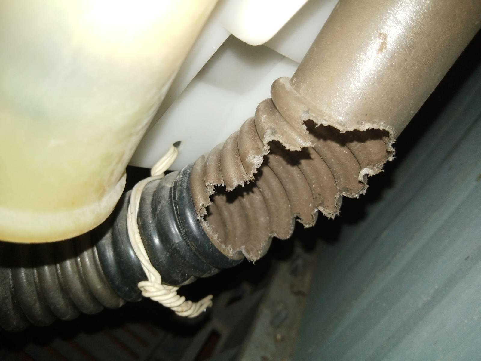 ช่วงทำความสะอาดบ้านแล้วขยับเครื่องซักผ้า เห็นพื้นใต้เครื่องมีรอยเปียกกับฟอง(นิดหน่อย) เลยเปิดฝาหลังออกดู เห็นท่อมีรอยขาดคล้ายถูกกัด