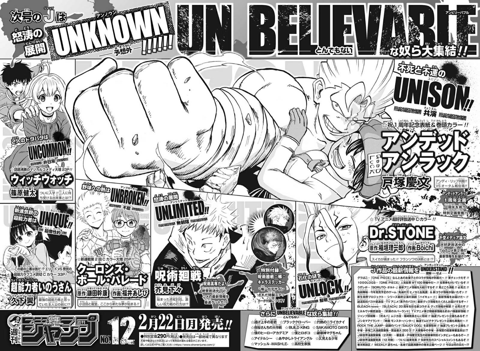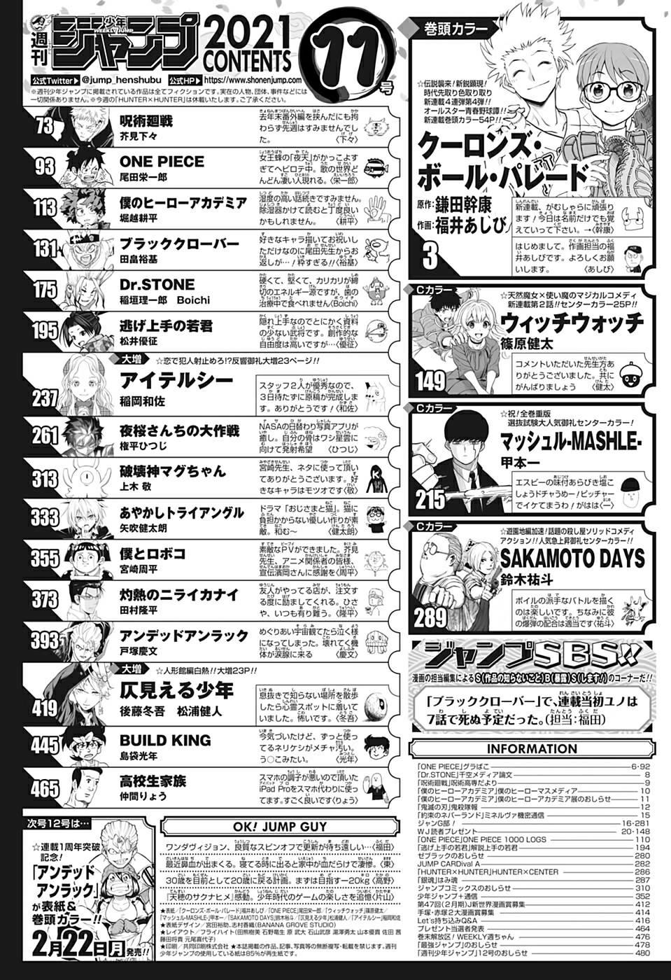 - จัมป์ฉบับนี้จะอัพลงM+ในวันที่ 14 กุมภาพันธ์ เวลา 23.00 น. https://mangaplus.shueisha.co.jp/updates
