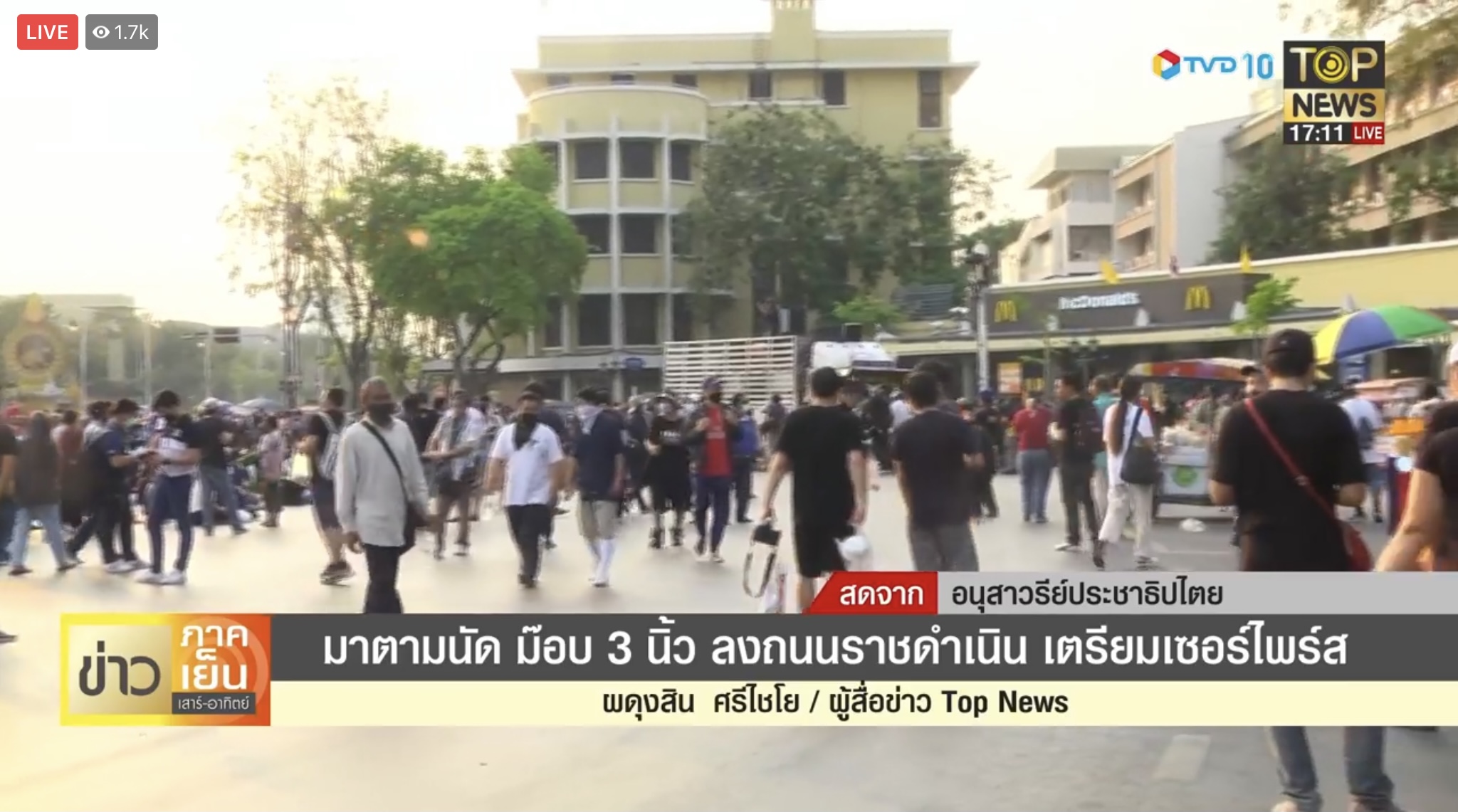 ภาพสด ม็อบ 3 นิ้วตอนนี้ คนดูโล่งนะ ขนาดนี่รูปหน้ารถขยายเสียงนะ นัด นับเลข 1 ถึงล้าน ตั้งแต่บ่าย 3 ตอนนี้ 5 โมงกว่าแล้ว