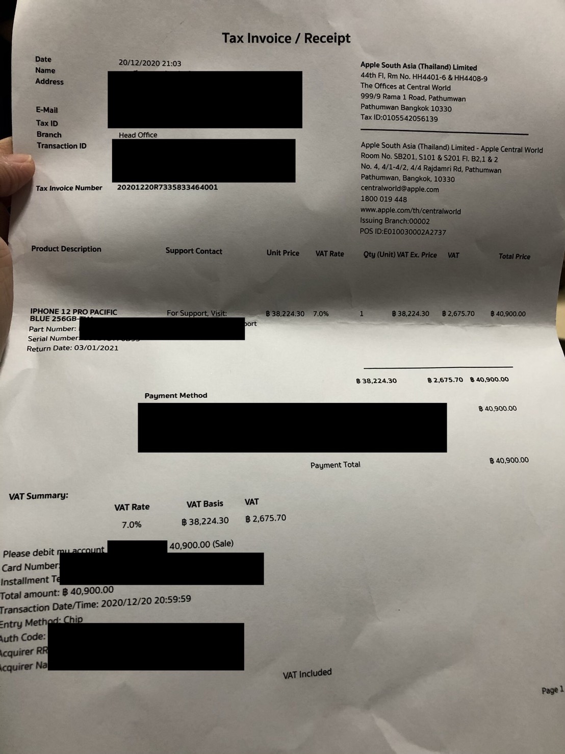 เราได้ซื้อ Iphone 12 pro 256GB จาก Apple store สาขา Central World ในวันที่ 20 ธันวาคม พ.ศ.2563