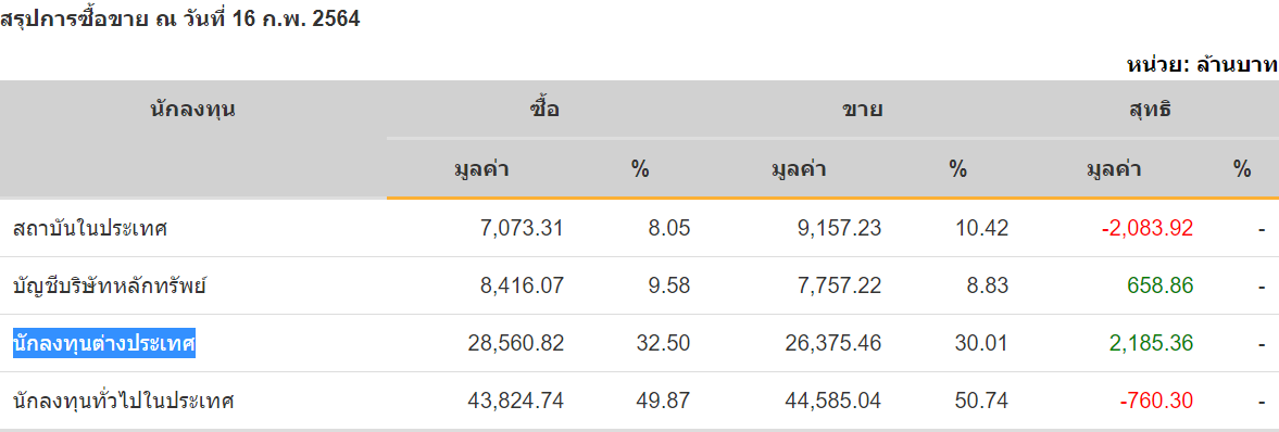 Sinthorn Summary 16/2/2564 : ต่างชาติซื้อสุทธิ 2,185.36 ลบ.