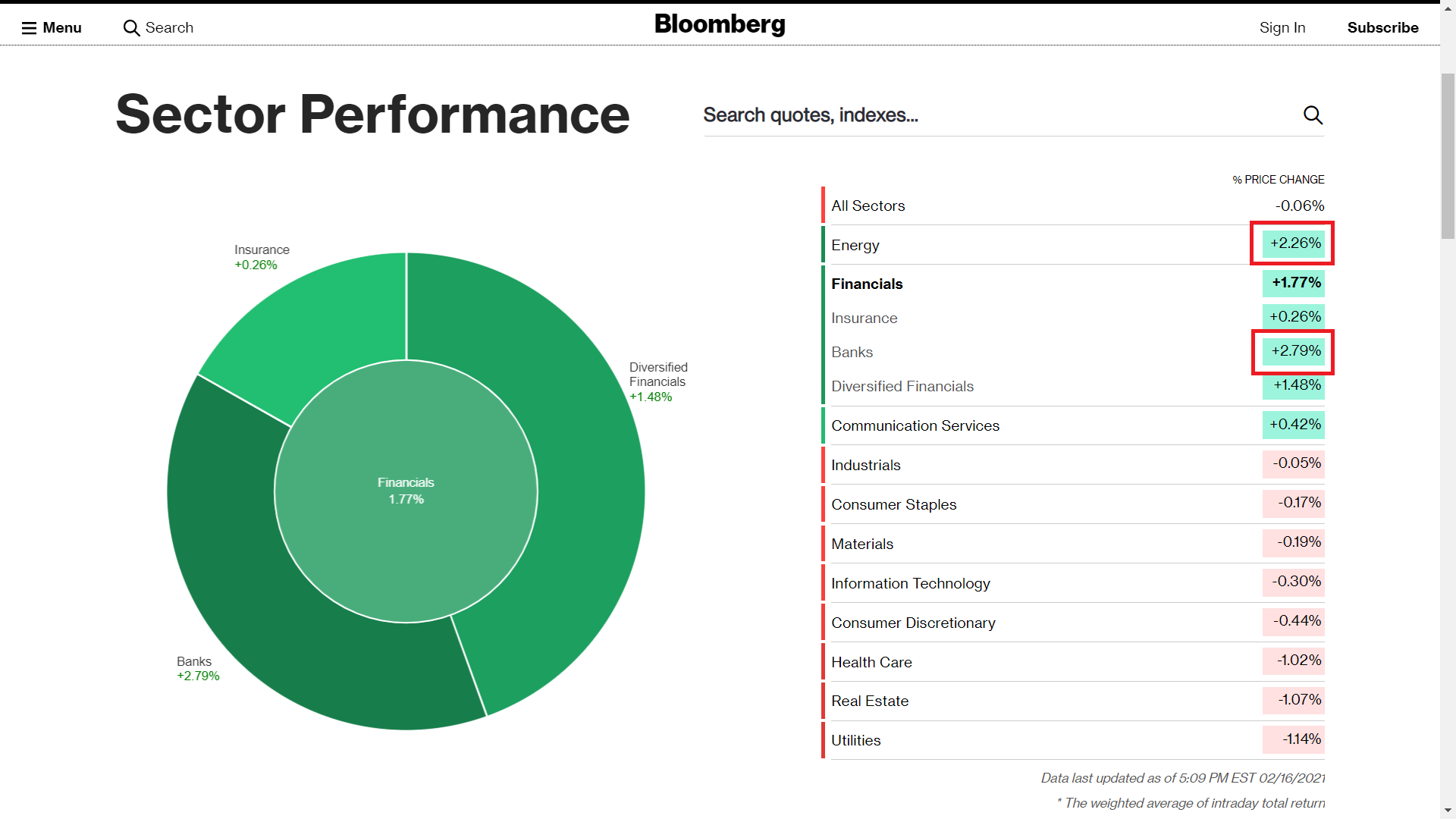 US Sector Performance 16 FEB 2021, Energy +2.26% Banks +2.79%