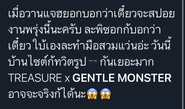-และวันนี้บ้านไซต์ของ TREASURE หลายบ้านทวิต อิโมจิรูป 😎 นี้กันและยังมึบางบ้านที่แคปชั่นเป็นทั้งตัวย่อ GM และ คำว่า Gentle Monster เป็นภาษาเกาหลี