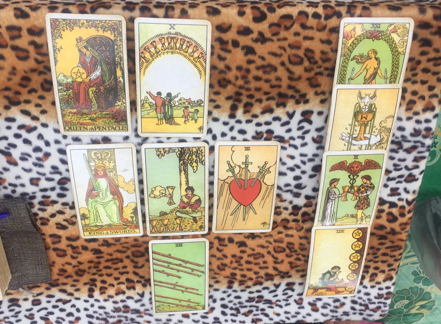 สวัสดีค่ะ เราไปเที่ยวงานวัด แล้วเจอโต๊ะดูดวงไพ่ แม่หมอให้ตั้งจิตและเปิดไพ่ 10 ใบ แต่เราฟังแกไม่ค่อยได้ยิน เนื่องจากที่งานมีเสียงดัง ทั้งวงดนตรี และรถราง เราถามถึงอนาคตและความรักค่ะ ช่วยแปลความหมายให
