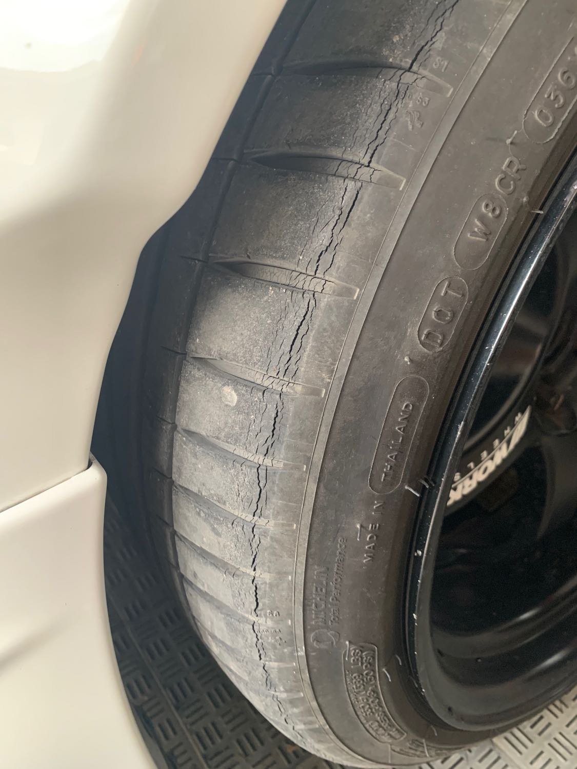 ผมจะไปต่างจังหวัด ปกติขับความเร็ว 90 -100 กิโลเมตรต่อชั่วโมง พอดีเจอหน้ายางมีรอยแตกแบบนี้(เฉพาะยางหน้าสองเส้น) ยังพอขับได้ไหมครับ หรือต้องเปลี่ยน อายุยาง สองปี แก้มยังไม่มีรอยปริแตก มีเฉพาะรอยในรูป