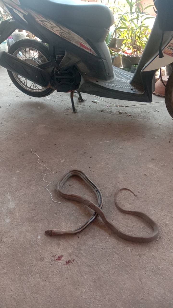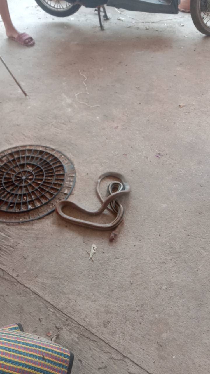 เมื่อตอนหัวค่ำพอดีไม่อยู่บ้าน อยู่งานเลี้ยง ลูกส่งไลน์มาว่างูอยู่ในบ้านเ ทียบดูกับที่ตักผงนะครับ ดูแล้วไม่เหมือนงูที่ดคยเข้ามา เช่นปี่แก้วที่คุ้นเคย ทรงมันคล้ายงูเห่า ลูกบอกว่ามันแผ่แม่เบี้ยด้วย