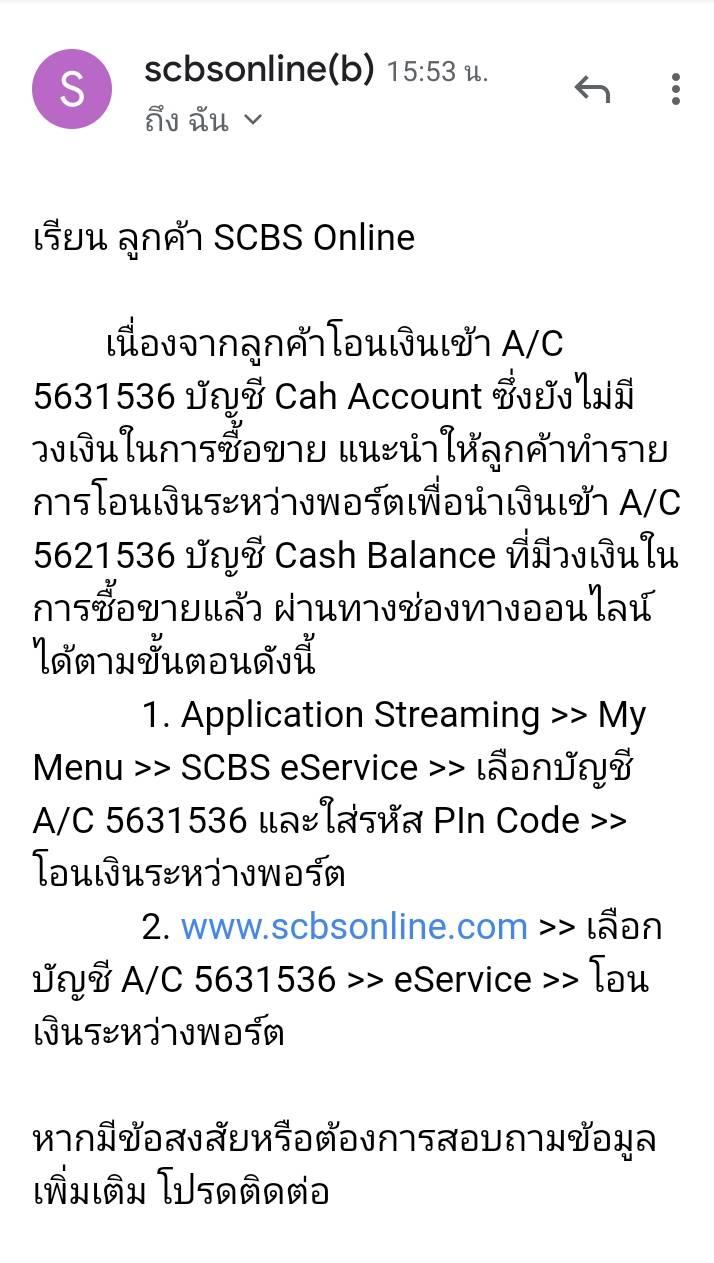 รอการรับการติดต่อโดยทางผมก็ทั้งโทร เบอร์ของโบรฺ์ก scbs ติดต่อทุกช่องทาง จนวันนี้โทรไปหาคอลเซนเตอร์ธนาคาร ก็บอกว่าต้องติดต่อหน่วยงานของ scbs คือใช้ทั้งเมล เบอรฺ อินบอค ข้อความได้รับคำตอบ ว่า ให้รอ ตามลำดับ แถม ชี้แจงมาทางอีเมลตรวจสอบกับสลิป ก็ไม่ได้ตรงกับที่ทาง ref1 เกิดขึ้นทำรายการไม่มีเงินเข้าระบบ จะตรวจสอบ อะไร แล้วก็จะบอกว่าจะดำเนินการในวันถัดไปของเวลาทำการ ตอนนี้รวมแล้ว 3 วัน พรุ่งนี้ก็น่าจะบอกติดวันหยุด บวกกับ เสาร์ อาทิตย์ โน่น กว่าจะติดต่อมา ก็รวมแล้ว 6 วันพอดี ซึ่งก็ไม่รู้ว่าจะเชคให้ได้ไหม