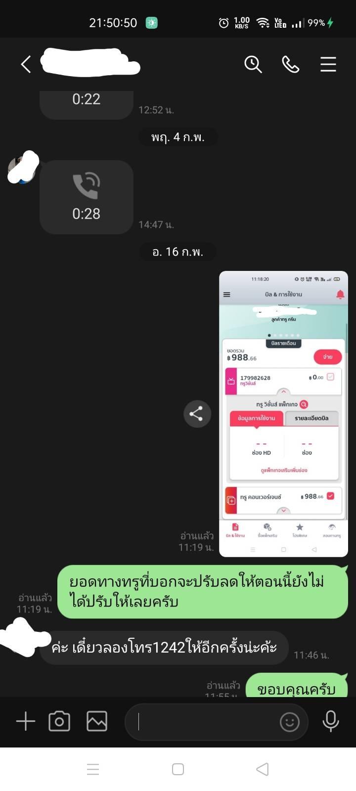 😡😡😡ค่ายทรูคงเป็นอะไรที่คงขยาดอีกแล้วสำหรับผม ก่อนหน้านี้ก็เคยส่งเรื่องไปว่าทำไมตอนติดตั้งบอกสัญญาโปรลด1ปีคือเดือนละ400กว่าบาท แต่พอใช้ไปผ่าน6เดือนก็คิดเต็มเลยไม่มีส่วนลดให้ ก็เลยโทรคุยกับเซล เซลบอกคุยกับทางทรูศูนย์ใหญ่แล้วเค้าจะทำเรื่องลดให้ประมาณไม่เกินวันที่14-15 ก.พ.ค่อยจ่าย และรอให้ทางศูนย์ทรู1242โทรมา แต่รอแล้วรออีกก็ยังไม่โทรมาหาและไม่ปรับลดให้ **จนสุดท้ายผมต้องยอมจ่ายเต็มเอง***ขี้เกียจตามเรื่องเพราะบ่ายเบียงทำให้เสียเวลาและเสียอารมณ์ การติดตามและติดต่อของทรูก็โครตห่วย พอจ่ายเต็มแล้วสัญญานเนตบ้านก็โครตห่วยเลยจะเป็นช่วงค่ำตลอดทุกวัน จริงๆก่อนหน้านี้ ตอนโปร6เดือนแรกไม่ค่อยจะมีปัญหาเท่าไหร่(ถึงมีแต่ก็น้อย) แต่พอหมดโปรส่วนลด6เดือนนี้ เริ่มมีปัญหาเหมือนดังในกระทู้พันทิปบอกเลย ตอนนี้ไม่ต้องติดต่อหลังไมค์มาแล้วนะครับ ติดต่อไปก็เท่านั้นไม่เคยแก้ปัญหาอะไรให้ได้เลย พอมีปัญหาก็บอกให้หลังไมค์มาคุยตลอด พอคุยแล้วก็ไม่สามารถแก้ไขอะไรได้ แต่ผมก็เข้าใจเพราะคุณเป็นพนักงานรับเรื่องไม่สามารถตัดสินอะไรได้ ต้องส่งเรื่องและรอขออนุมัติจากข้างบนก่อน ถึงจะตัดสินใจได้และวันๆนึงพวกคุณรับเรื่องหลายพันหลายหมื่นปัญหาด้วย ตอนนี้ก็เลยไม่อยากคุยอะไรให้เสียเวลาและเสียอารมณ์อีกต่อไปแล้วครับ ขอทนใช้ให้ครบสัญญา1ปีก็พอแล้วย้ายค่ายเลย😡😡😡