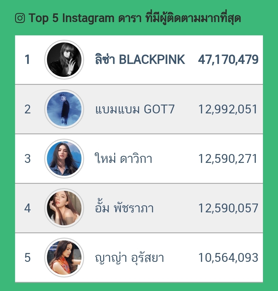 10 อันดับชาวไทย ที่มีคนติดตามมากที่สุดบน Instagram "ลิซ่า ลลิษา" ขึ้นที่หนึ่งแทน "อั้ม พัชราภา" เรียบร้อย 15/11/2018