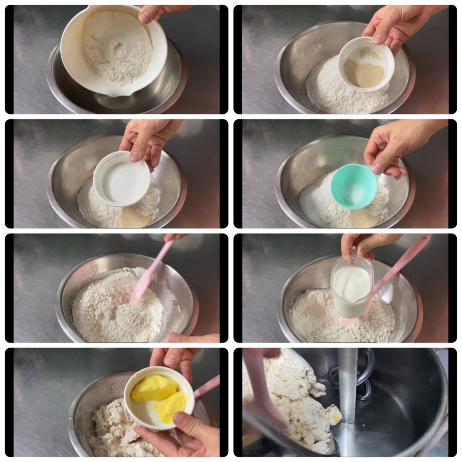 - ผสมแป้งขนมปัง ยีสต์ เกลือ และน้ำตาล รวมกัน
