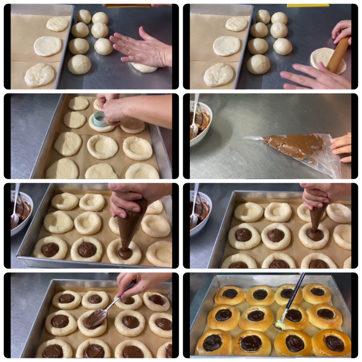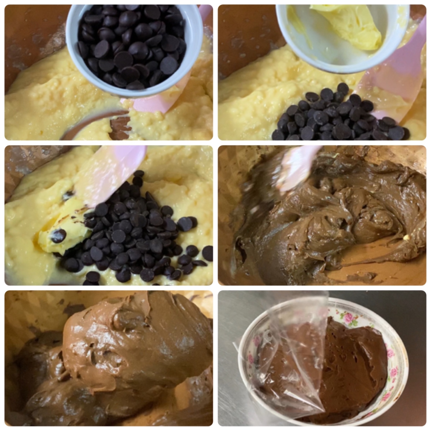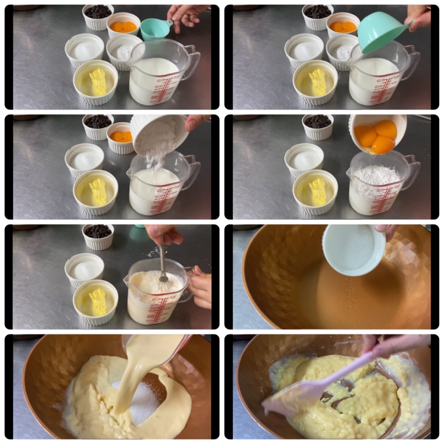 - พักแป้ง ให้ขึ้นเป็น 2 เท่า บีบคัสตาร์ดช็อกฉกแคบลงไปและนำไปอบ