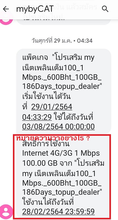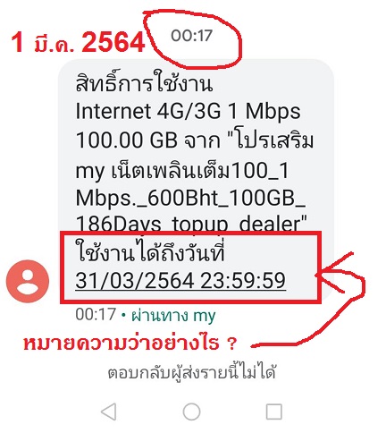 เพิ่งซื้อ โปรเสริม my 6เดือน 600บาท เมื่อ 29 ม.ค.2564 เช้านี้ 1 มี.ค. 64 มี SMS มาแจ้งบอกว่า ใช้งานได้ถึง 31 มี.ค.64
