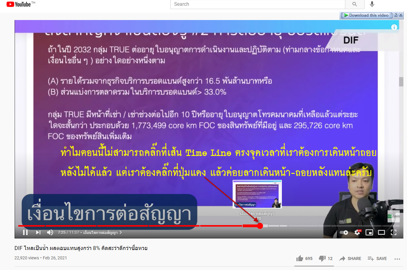 ก่อนหน้านี้ เวลาดู App YouTube บนกล่อง Android TV ผมสามารถคลิ๊กที่เส้น Time Line ตรง ณ จุดเวลาที่เราต้องการเดินหน้าถอยหลังได้เลย แต่ตอนนี้ทำอย่างนี้ไม่ได้แล้ว เราต้องคลิ๊กที่ปุ่มแดงบน Time Line แล้วค่อยคลิ๊กเพื่อลากเดินหน้า-ถอยหลังแทนครับ เพิ่งจะเป็นมาได้ไม่นานนี้เอง ผมต้องแก้ไขอย่างไร หรือว่าเป็นเพราะว่า YouTube เขาต้องการสร้างให้เป็นแบบนี้ครับ (ดูรูป) หมายเหตุ ถ้าดูบน PC หรือ Notebook สามารถทำได้ตามปกติไม่มีปัญหา