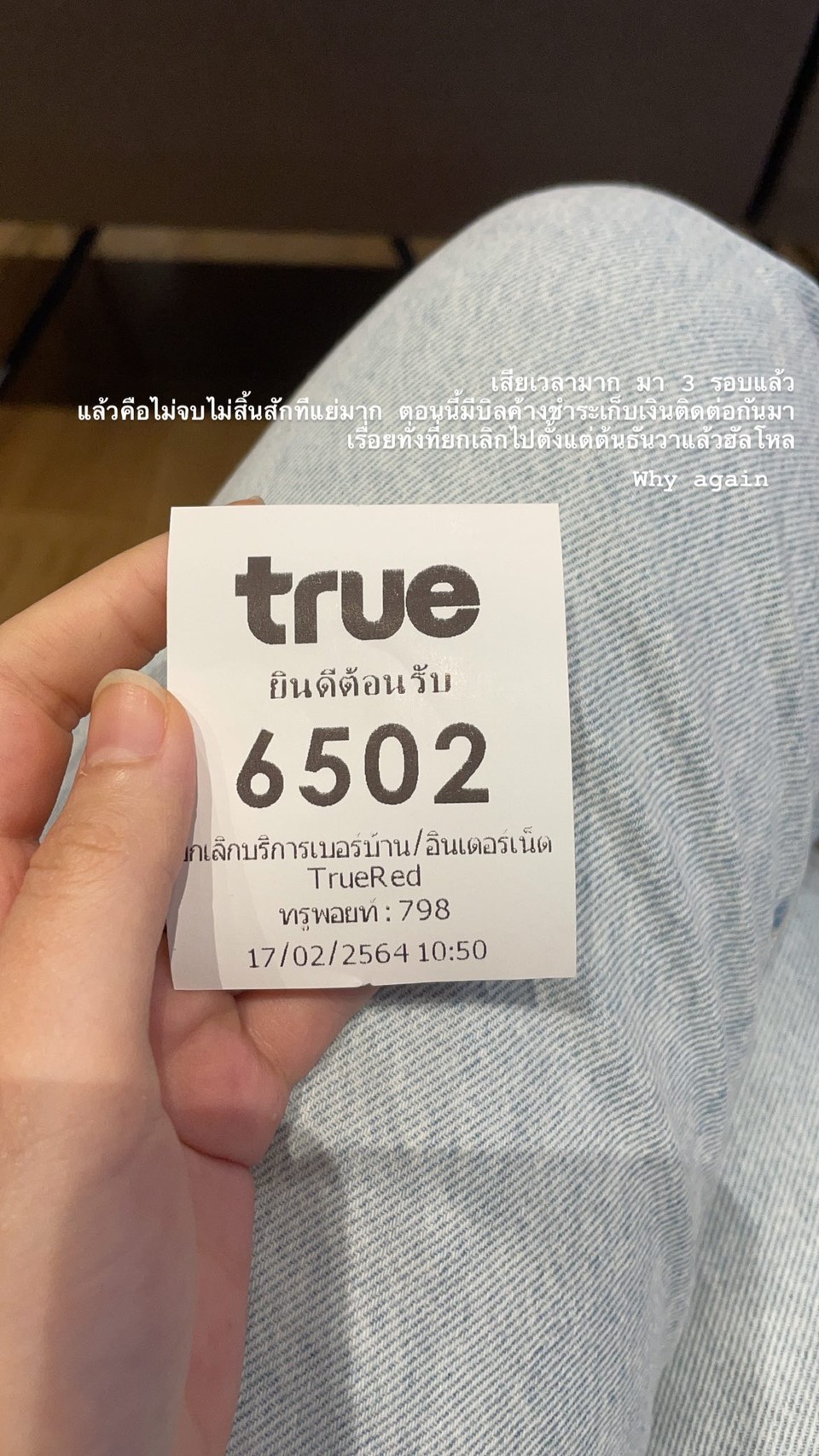 พอสักประมาณต้น กพ มีโทรมาทวงค่าบริการ พอสอบถามกับพนักงานปลายสายได้คำตอบมาว่าไม่เคยมีเรื่องคืนอุปกรณ์และยกเลิกบริการในระบบเลยไปที่ทรูชอปสาขาดังกล่าวอีกครั้ง จากการตรวจสอบวันนั้นพนักงานแจ้งว่าไม่มีการทำเรื่องใดๆ ในระบบจริง เราขอพบพนักงานคนที่รับเรื่องคราวก่อนแต่พนักงานคนนั้นลาจึงไม่ได้พบ พนักงานที่บริการในวันนั้นจึงแจ้งว่าจะโทรหาเราในวันรุ่งขึ้นเมื่อได้คำตอบว่าทำไมพนักงานคนดังกล่าวจึงไม่ทำเรื่องให้