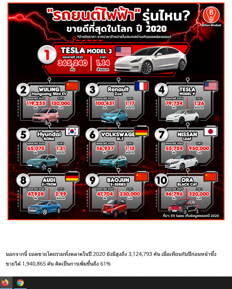 สรุป 10 อันดับยอดขาย “รถยนต์ไฟฟ้า” ทั่วโลก ในปีที่ผ่านมา..