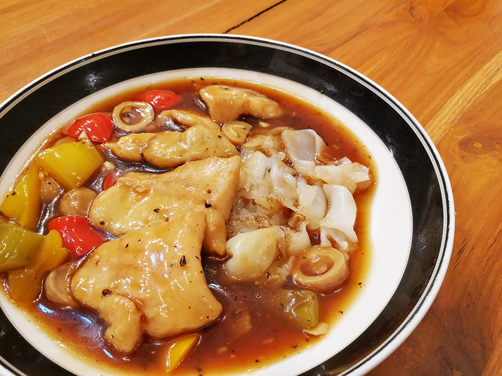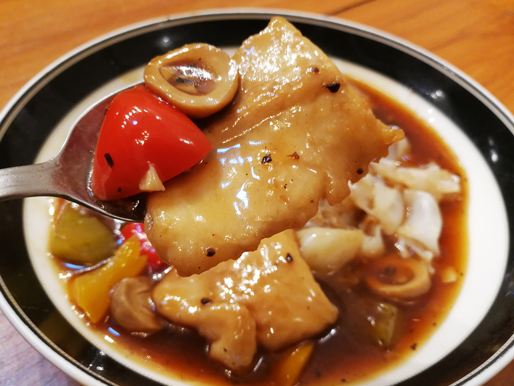 ถัดมาเป็นเมนูที่ดูแพง แต่ราคาไม่แพง ก๋วยเตี๋ยวราดหน้าปลาเต้าซี่ เมนูนี้จะคล้ายราดหน้าของไทย ตรงที่ใช้เส้นใหญ่ผัดกับกระทะให้หอม มีกลิ่นกระทะ ส่วนน้ำราดจะปรุงแบบจีน คือเป็นปลาทอด เอามาปรุงกับเต้าซี่ ใส่ผัก พริก และเห็ดบางชนิด ทำให้เป็นน้ำราดข้นๆ มีความหอมและได้กลิ่นอายความเป็นจีนแท้ๆเลยครับ หอมเต้าซี่ หอมกลิ่นน้ำซอส สำหรับปลาชิ้นพอดีคำ ความนุ่มกำลังดี ทอดมาสีสวย ไม่แน่ใจว่าคือปลาอะไร แต่ดูจากราคาน่าจะปลาดอลลี่ครับ ถือว่าเป็นจานที่ดูแพง และดูหรูมากครับ